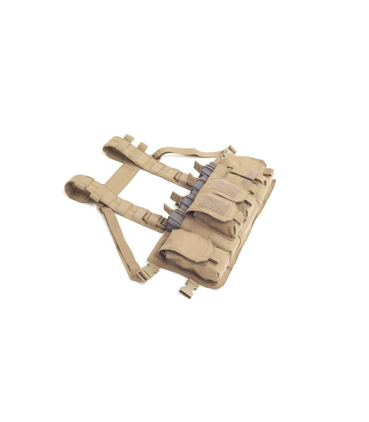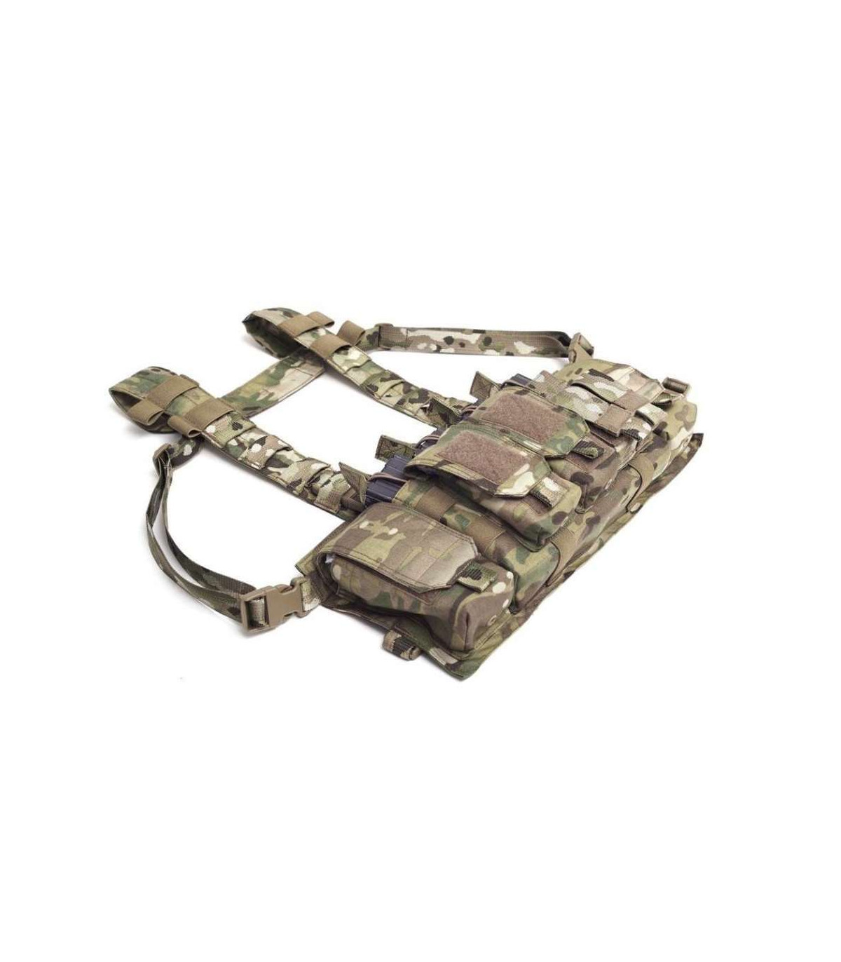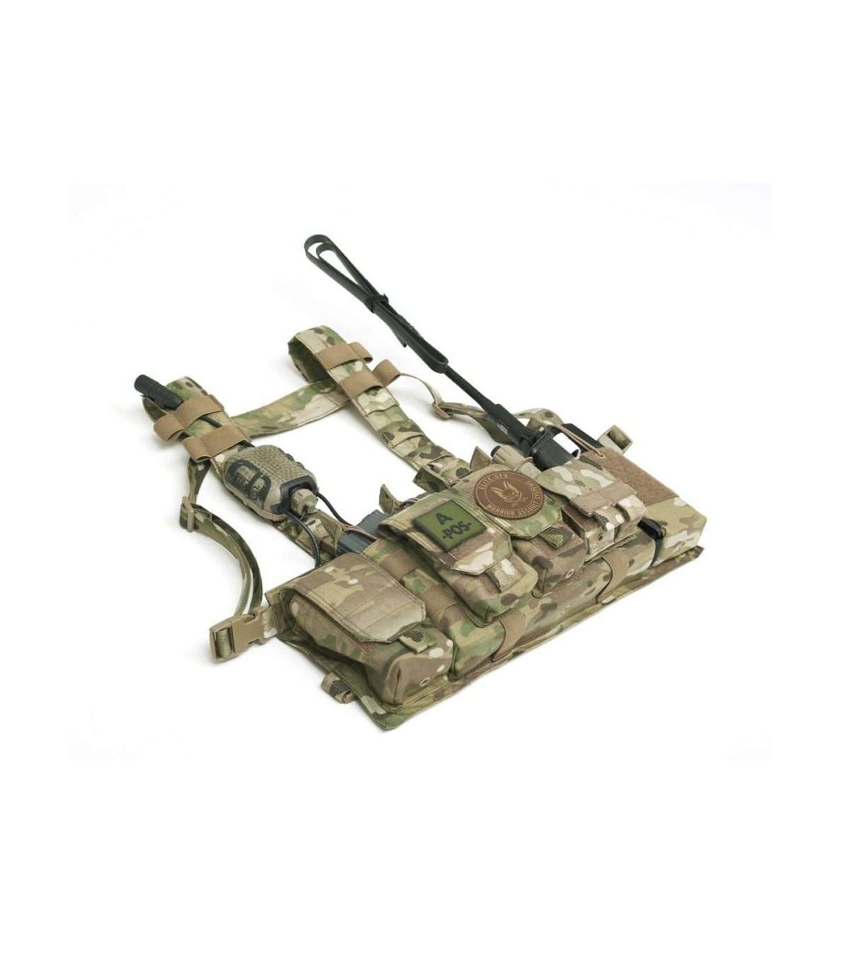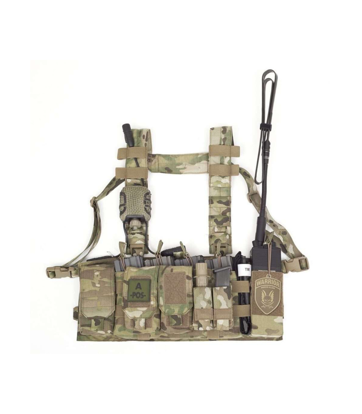 The FCR is designed to work as a compact Chest Rig in standalone configuration. The FCR accommodates 8 x M4 style mags with adjustable bungee retention which allows AK mags to be easy changed out. There are a total of 4 utility pouches. The end pouches can hold MBITR 148 radios there are elastic loops for storage of chemlights small torches etc at the sides of the end pouches. Warrior's DPDA-9 double pistol mag pouch is attached to the front of the rig with MOLLE and can be removed or replaced as required. The unique feature about the FCR is its ability to attach to Warrior’s new RPC (Recon Carrier). Simply remove the shoulder and rear straps and all the remaining clips line up with the corresponding ITW clips located on the front and sides of the RPC carrier creating a scalable platform.