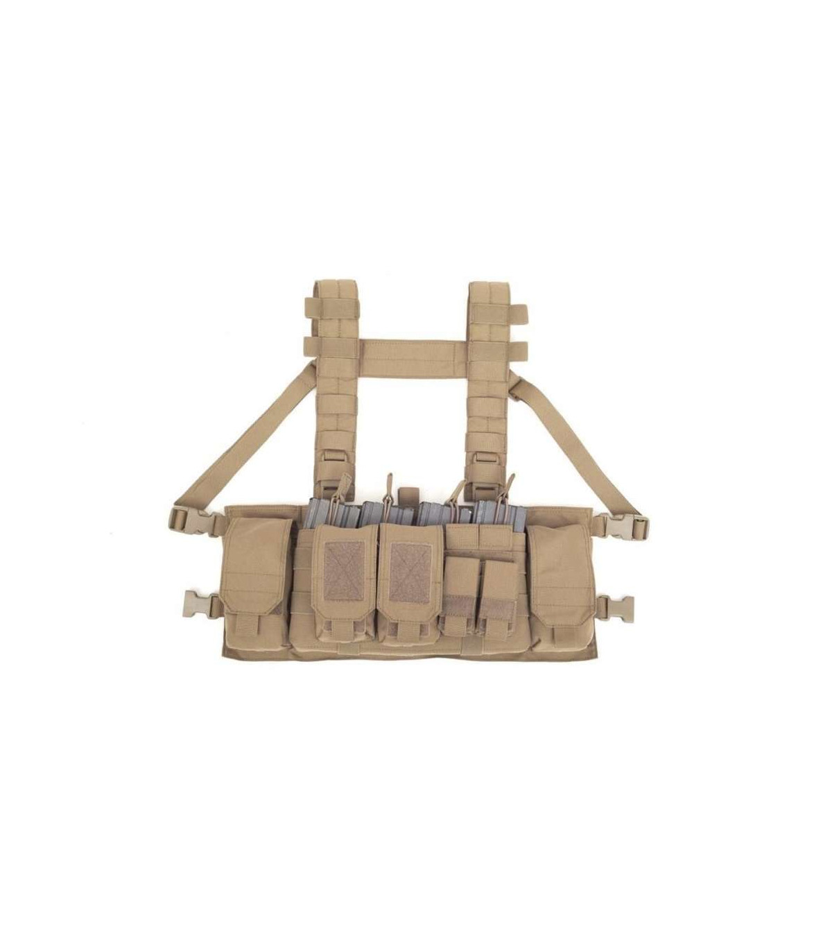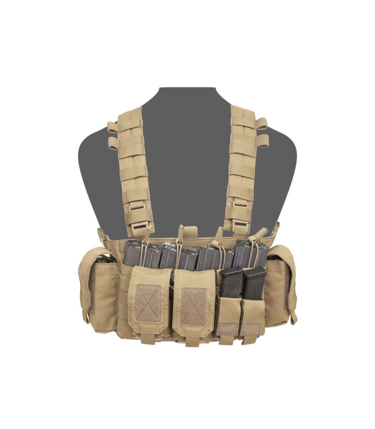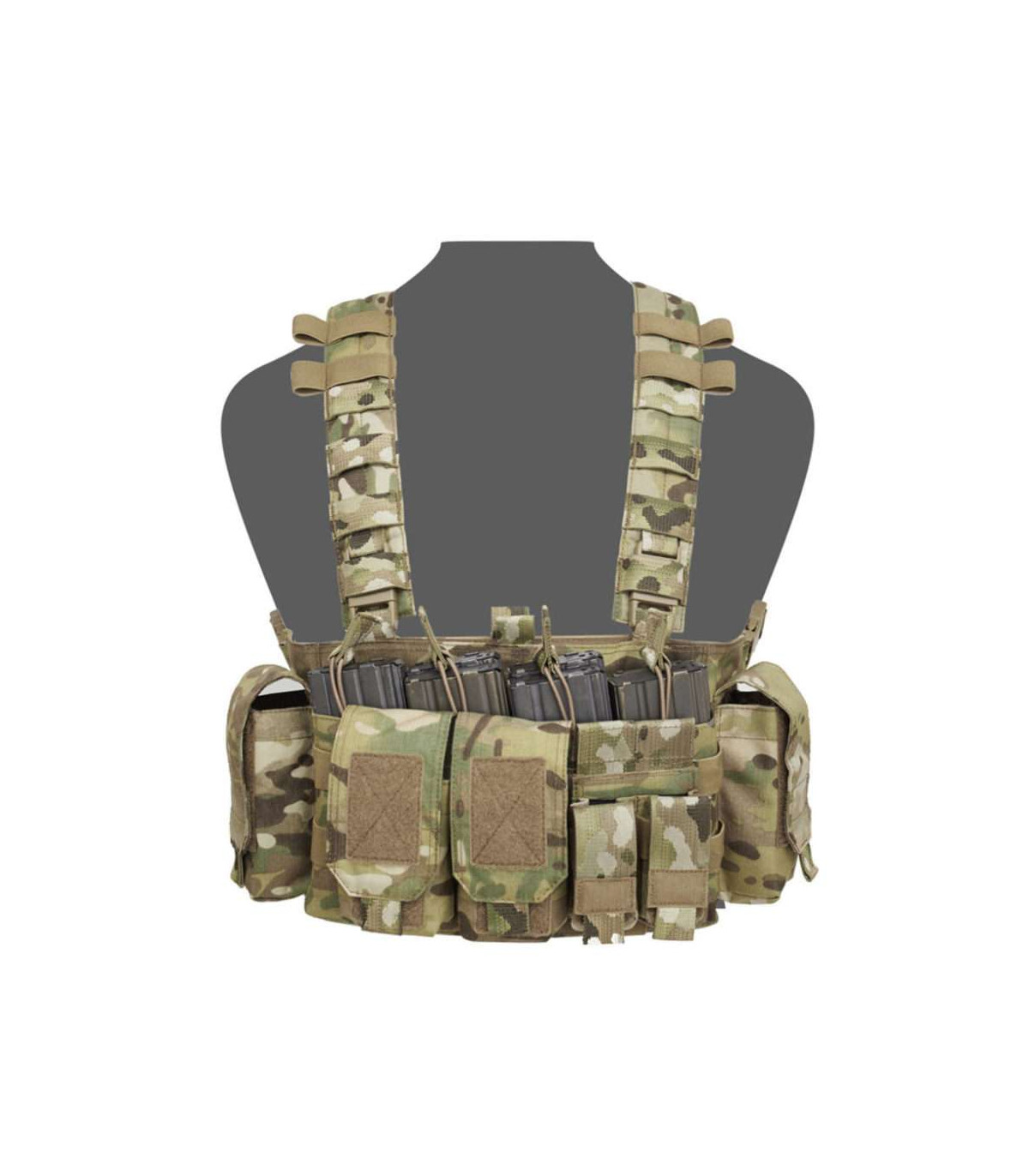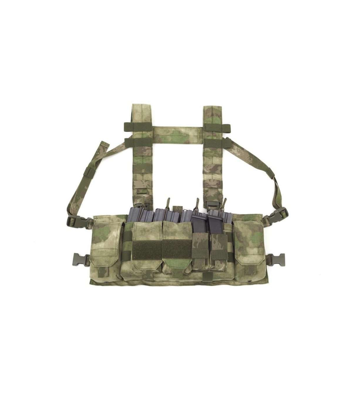 The FCR is designed to work as a compact Chest Rig in standalone configuration. The FCR accommodates 8 x M4 style mags with adjustable bungee retention which allows AK mags to be easy changed out. There are a total of 4 utility pouches. The end pouches can hold MBITR 148 radios there are elastic loops for storage of chemlights small torches etc at the sides of the end pouches. Warrior's DPDA-9 double pistol mag pouch is attached to the front of the rig with MOLLE and can be removed or replaced as required. The unique feature about the FCR is its ability to attach to Warrior’s new RPC (Recon Carrier). Simply remove the shoulder and rear straps and all the remaining clips line up with the corresponding ITW clips located on the front and sides of the RPC carrier creating a scalable platform.