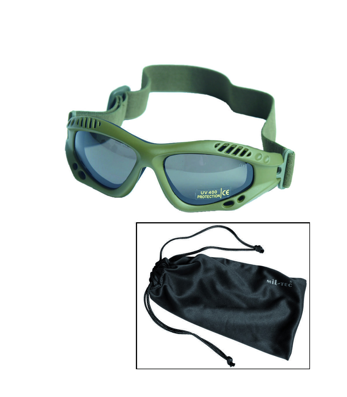 Featureing a plastic frame with ventilation system, elastic headband, outside antiscratch and inside antifog, including bag. These tactical googles can protect you all day long during shooting or parachute training.