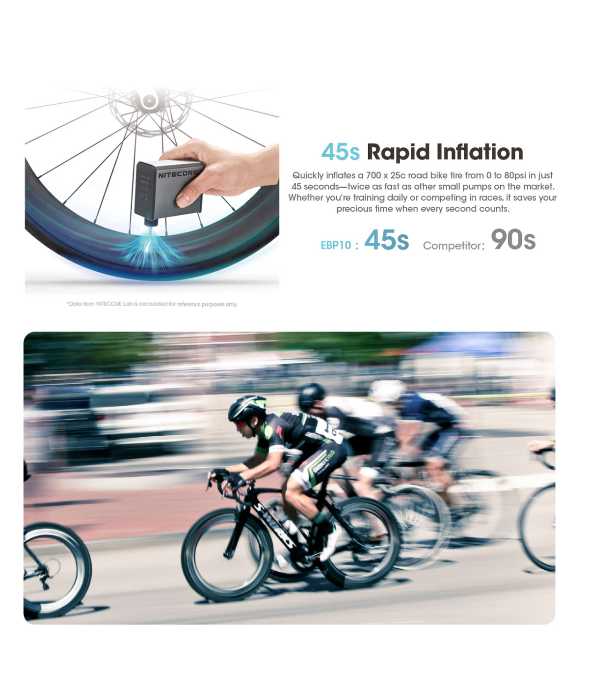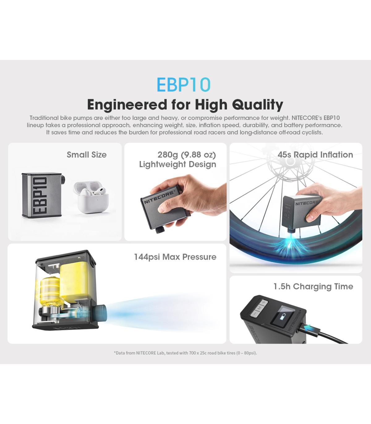 * Τα παραπάνω αναφερόμενα δεδομένα προέρχονται από το εργαστήριο της NITECORE , δοκιμασμένα με ποδήλατο δρόμου με ρόδα 700x25c (0-80psi)