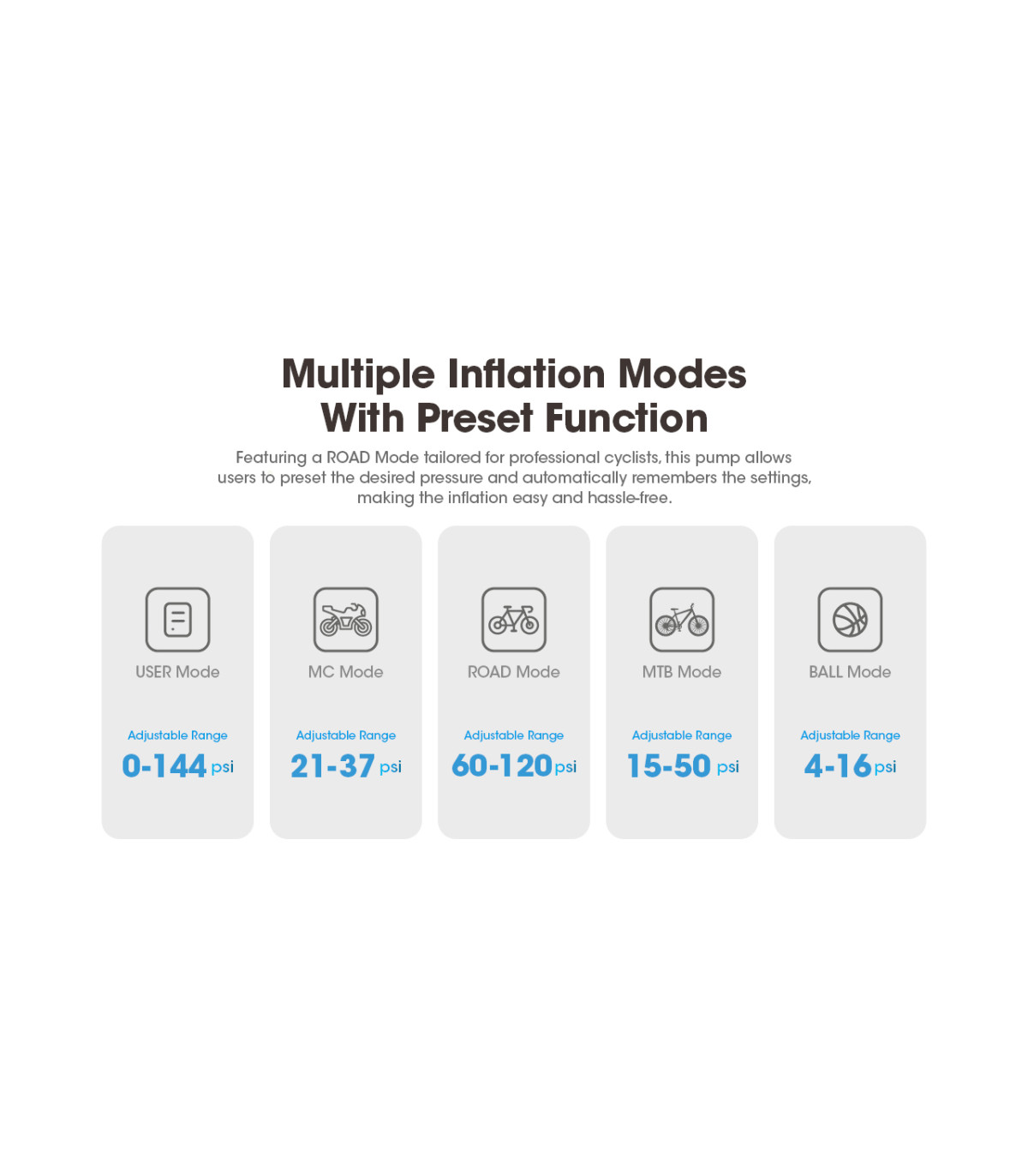 – Λειτουργία Ποδηλάτου δρόμου ……… Ρυθμιζόμενο εύρος από 60 έως 120 psi