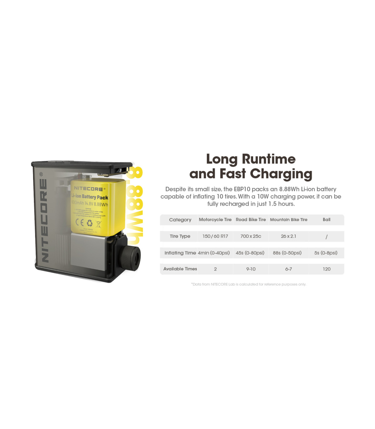 Παρά το μικρό της μέγεθος, η EBP10 διαθέτει μία μπαταρία Li-ion 8.88Wh  ικανή να φουσκώσει 10 ελαστικά.
