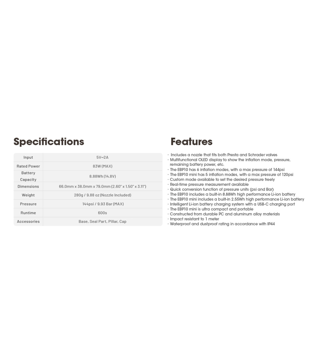– Η EBP10 mini διαθέτει 5 λειτουργίες φουσκώματος, με μέγιστη πίεση 120psi.