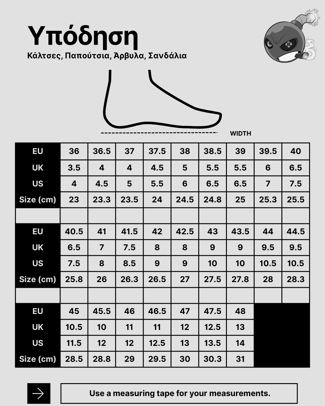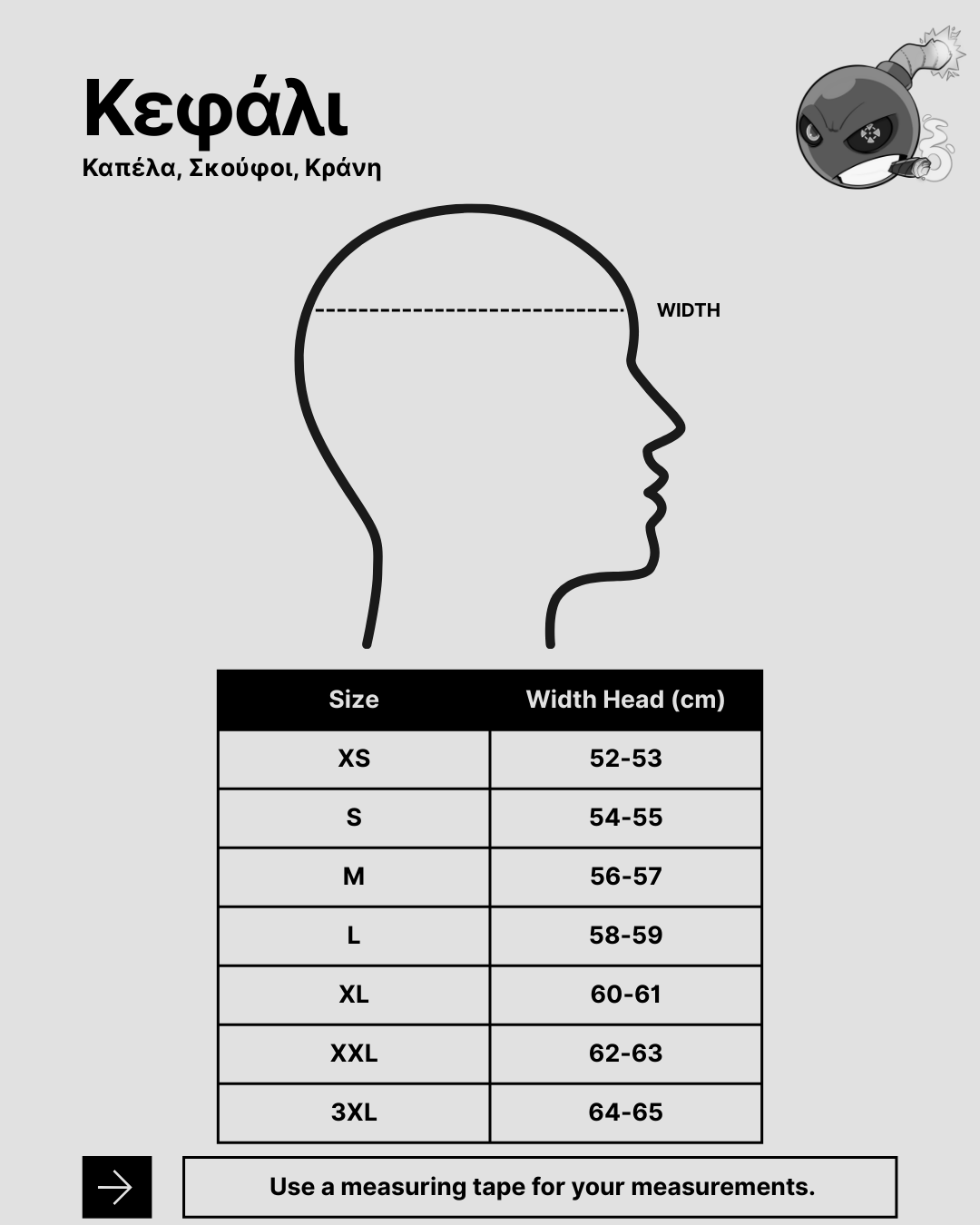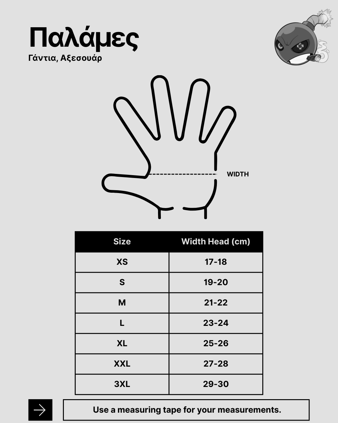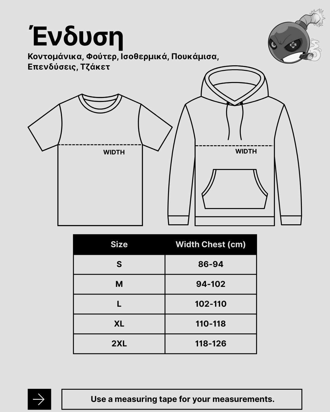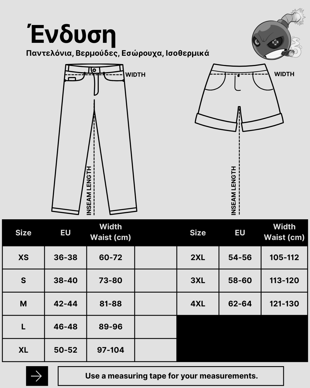 Ο πίνακας μεγεθολογίου είναι ενδεικτικός και αφορά στις περισσότερες μάρκες προϊόντων μας. Για περισσότερες πληροφορίες σχετικά με τα μεγέθη και την εφαρμογή των προϊόντων σωματομετρικά, καλέστε στην εξυπηρέτηση πελατών +30-2521032858 ή στείλτε το μήνυμά σας στην ηλεκτρονική μας διεύθυνση info@sabotage-oddal.gr