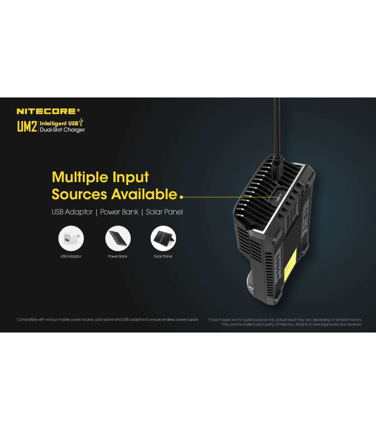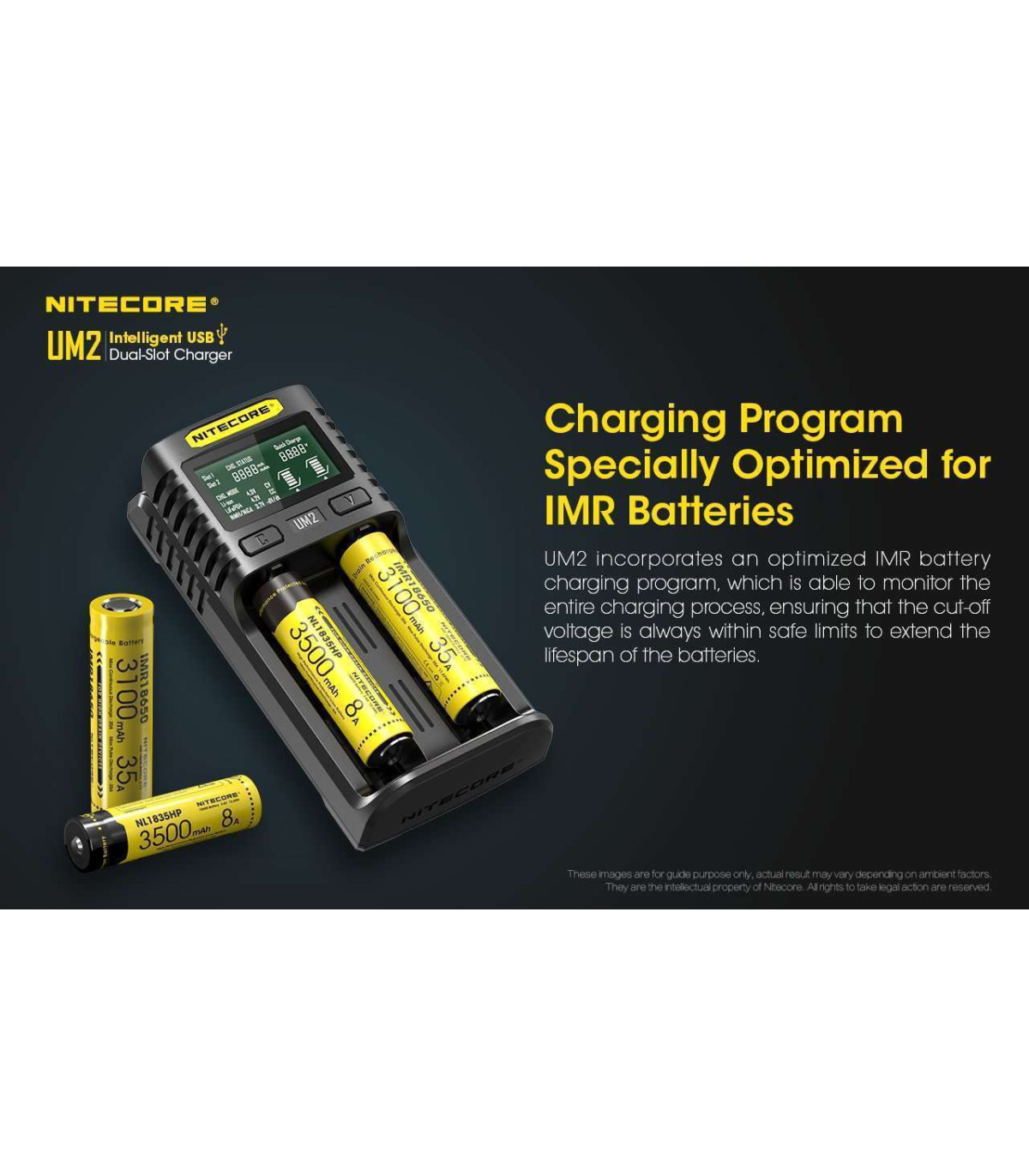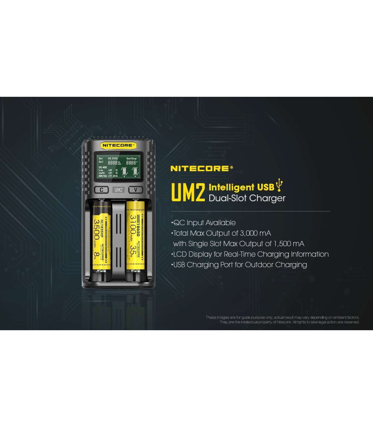 The new NITECORE UM2 is a QC input available, intelligent USB dual-slot charger, with a total max output of 3,000 mA and a single slot max output of 1,500 mA and is capable of charging 2 batteries simultaneously and controlling each slot independently. It only takes 2 hours to charge 80% of a 3,500mAh battery. The LCD screen can display a real-time information of Charging Current, Battery Voltage, Charged Volume and Charging time. It can enable an automatic detection of battery power level and automatic selection of the appropriate voltage and charging mode and automatic selection between 3 charging modes (CC, CV and -dV/dt). The charging parameters can be set manually to meet various charging needs. The specially designed Micro USB port is compatible with various mobile power source, solar panel and USB adaptors to ensure endless power supply. UM2 incorporates an optimized IMR battery charging program, which is able to monitor the entire charging process, ensuring that the cut-off voltage is always within safe limits to extend the lifespan of the batteries. The UM2 is compatible with 3.6V/3.7V Li-ion rechargeable batteries, 3.8V Li-ion rechargeable batteries, 1.2V Ni-MH/Ni-Cd rechargeable batteries and 3.2V LiFePO4 batteries. Multiple safeguards ensure the safe charging process, including anti-short circuiting and reverse polarity protection, overtime charging protection, over-discharged Li-ion battery activation and over-discharged IMR battery restoration. Apart from being constructed from durable and fire retardant PC materials, the built-in temperature regulation system is designed to prevent the overheat and to ensure the stability of the charging process. If there is no action to the buttons or batteries in 10 minutes, the screen will automatically go dim to save energy.