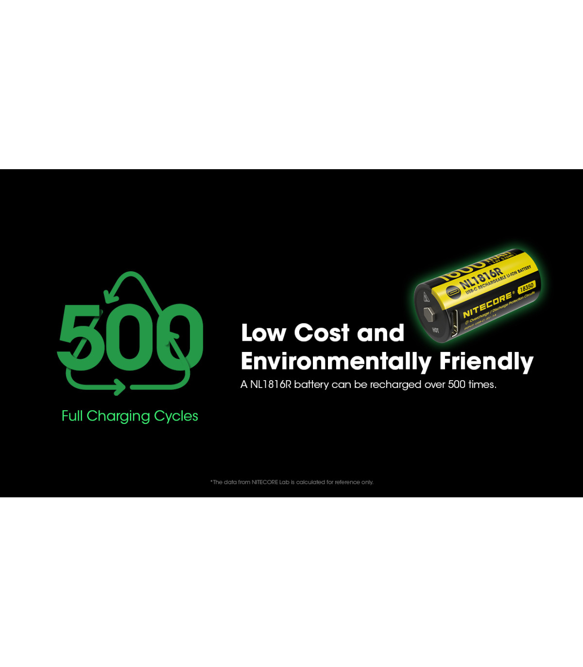 Μία μπαταρία NITECORE NL1816R μπορεί να επαναφορτιστεί για περισσότερο από 500 φορές.