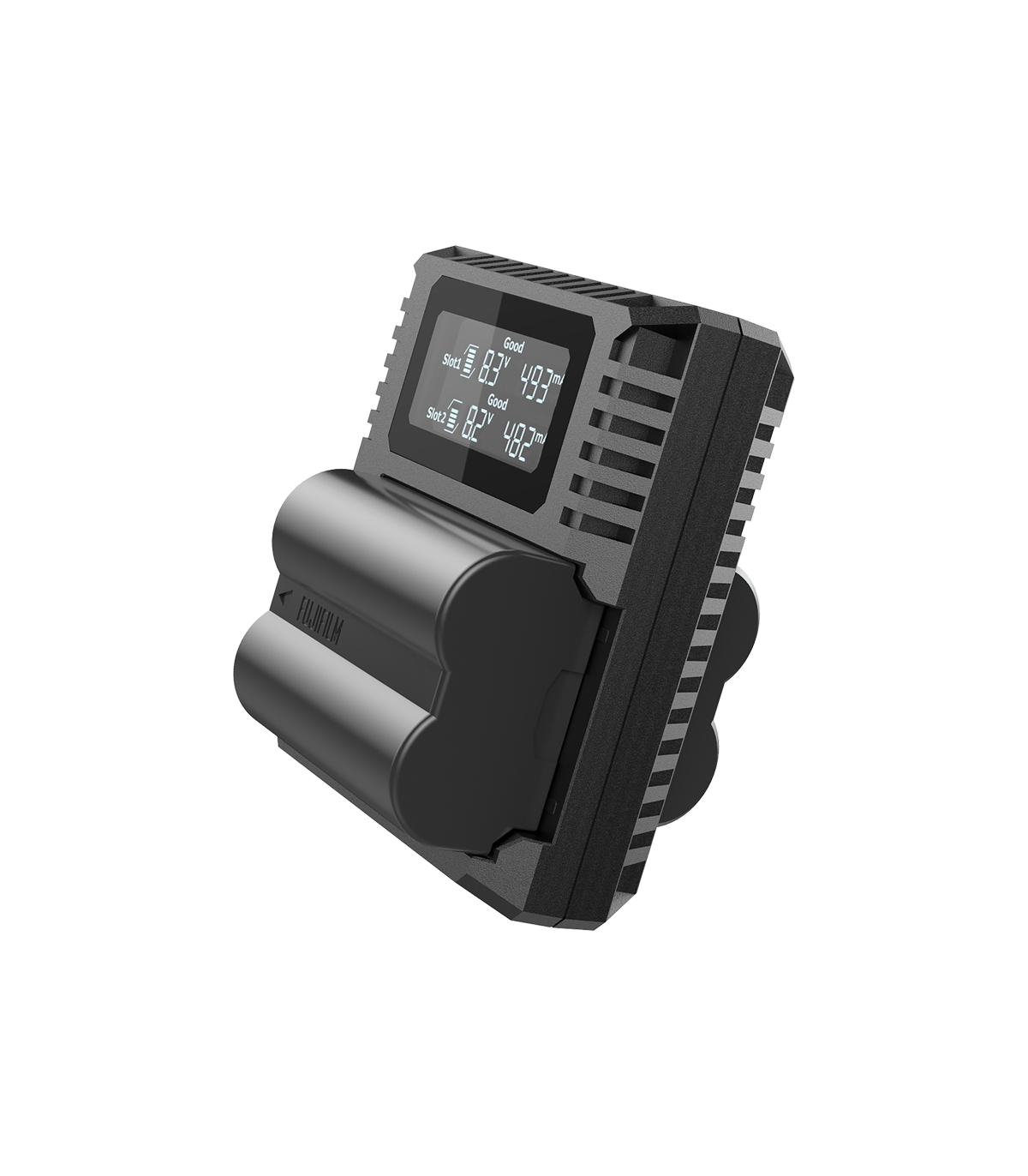 Διαθέτει δύο θέσεις φόρτισης για μπαταρίες Fujifilm NP-W235 και μπορούν να τοποθετηθούν ταυτόχρονα 2 μπαταρίες για φόρτιση.