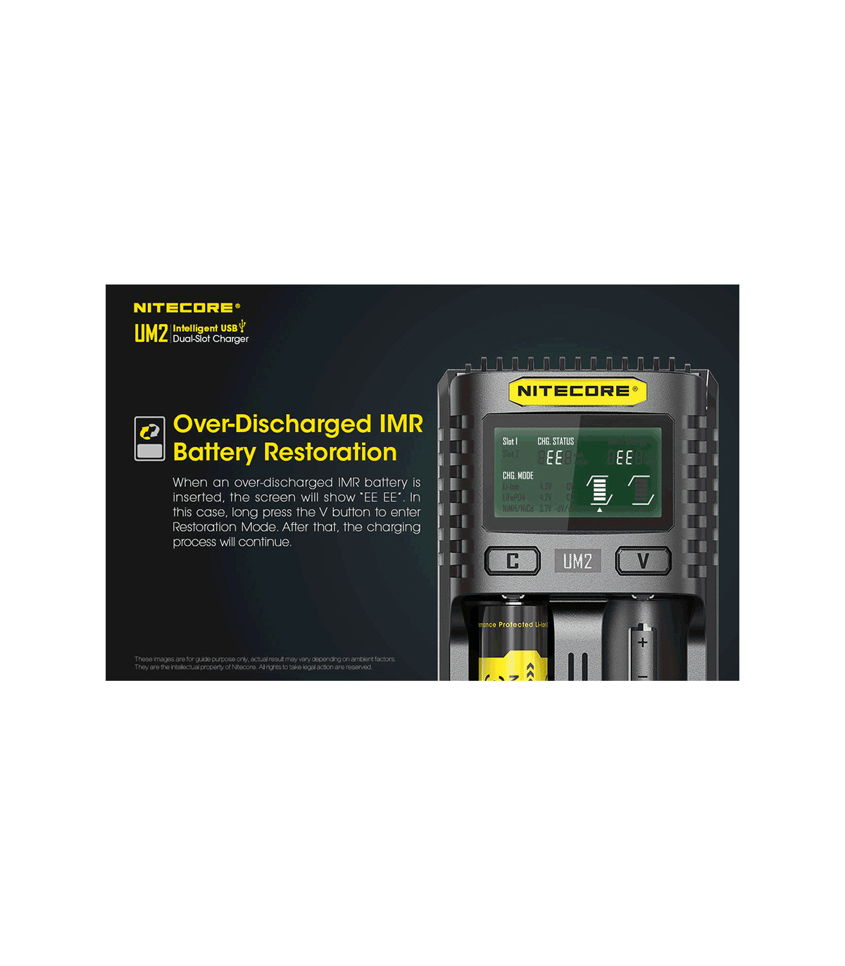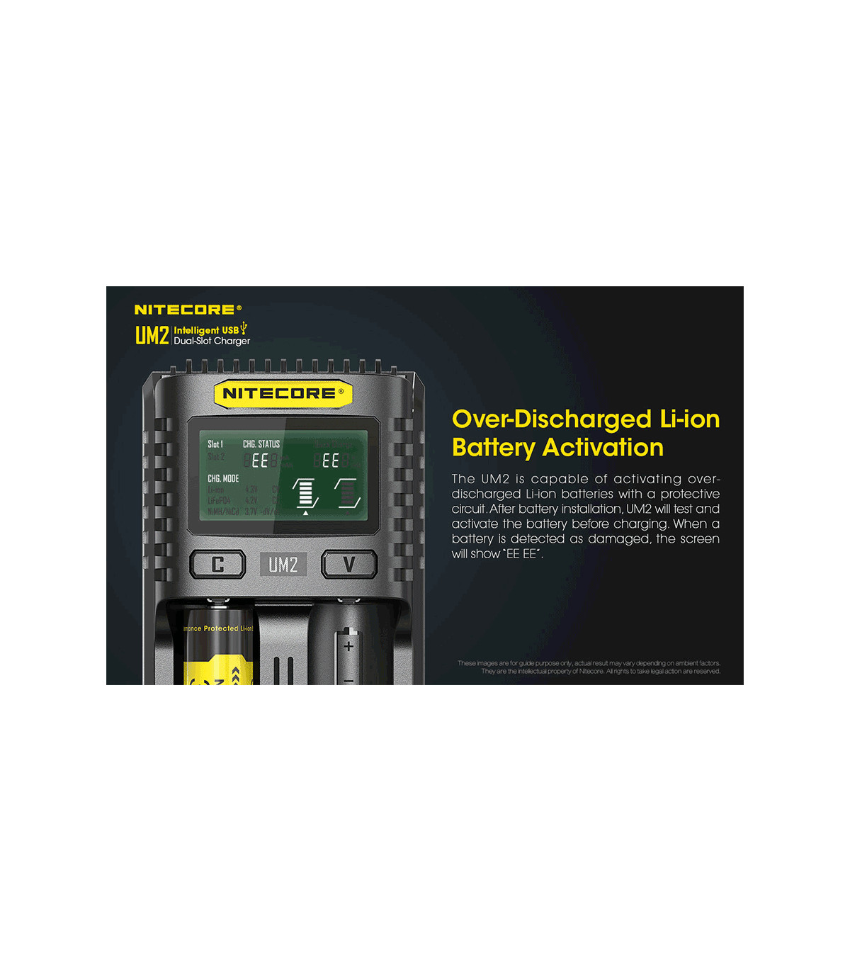 Έχει την δυνατότητα να ενεργοποιήσει υπερ-αποφορτισμένες μπαταρίες ιόντων λιθίου Li-ion. Ο UM2 θα ελέγξει και θα ενεργοποιήσει πριν ξεκινήσει την φόρτιση. Εάν η μπαταρία είναι κατεστραμμένη στην οθόνη θα εμφανιστεί το μήνυμα “ΕΕ ΕΕ”.