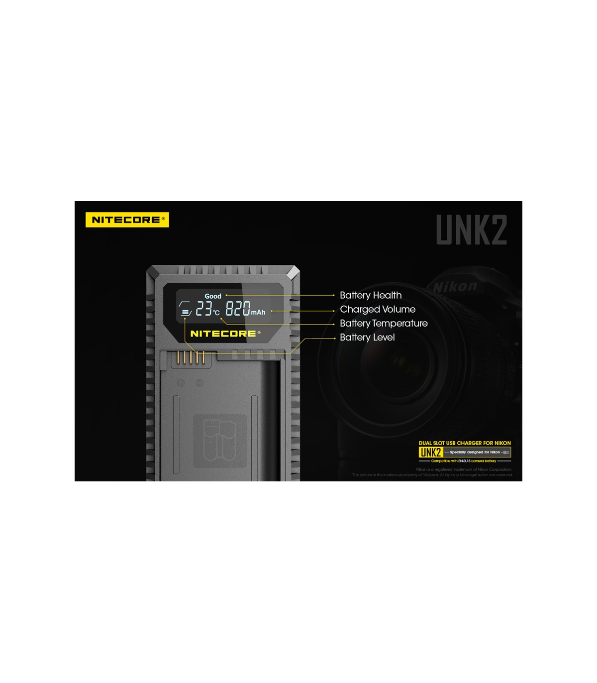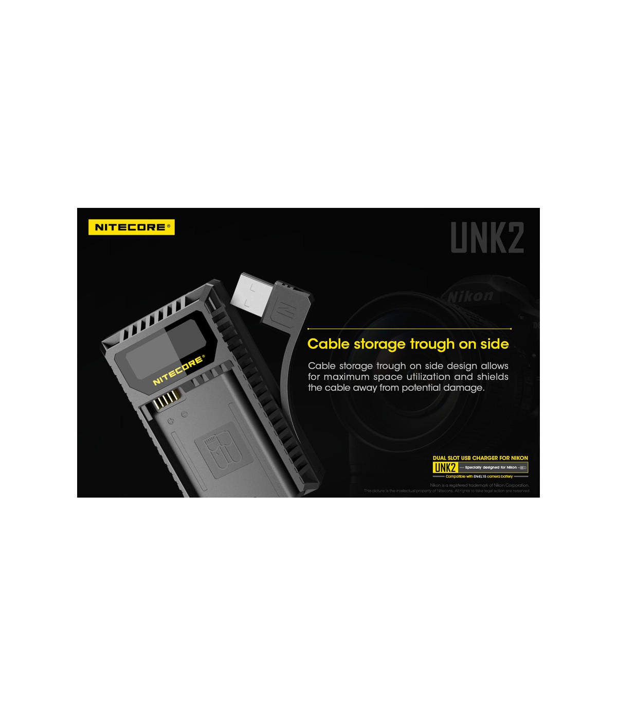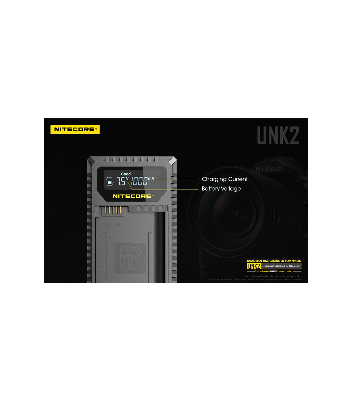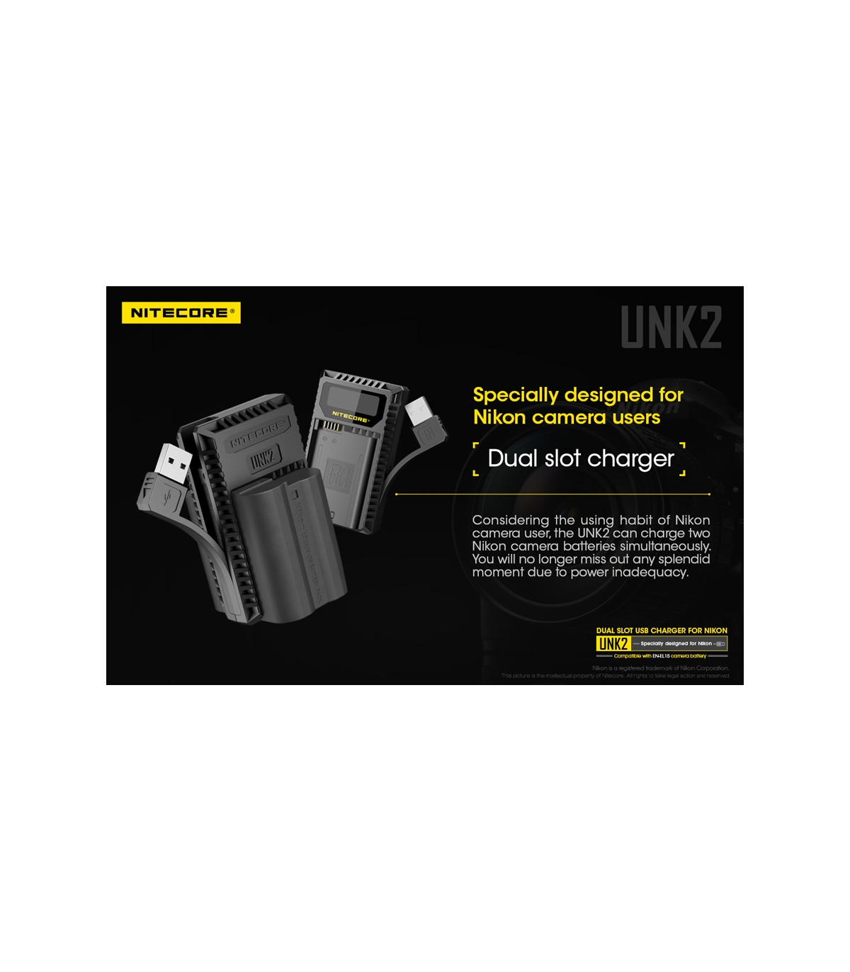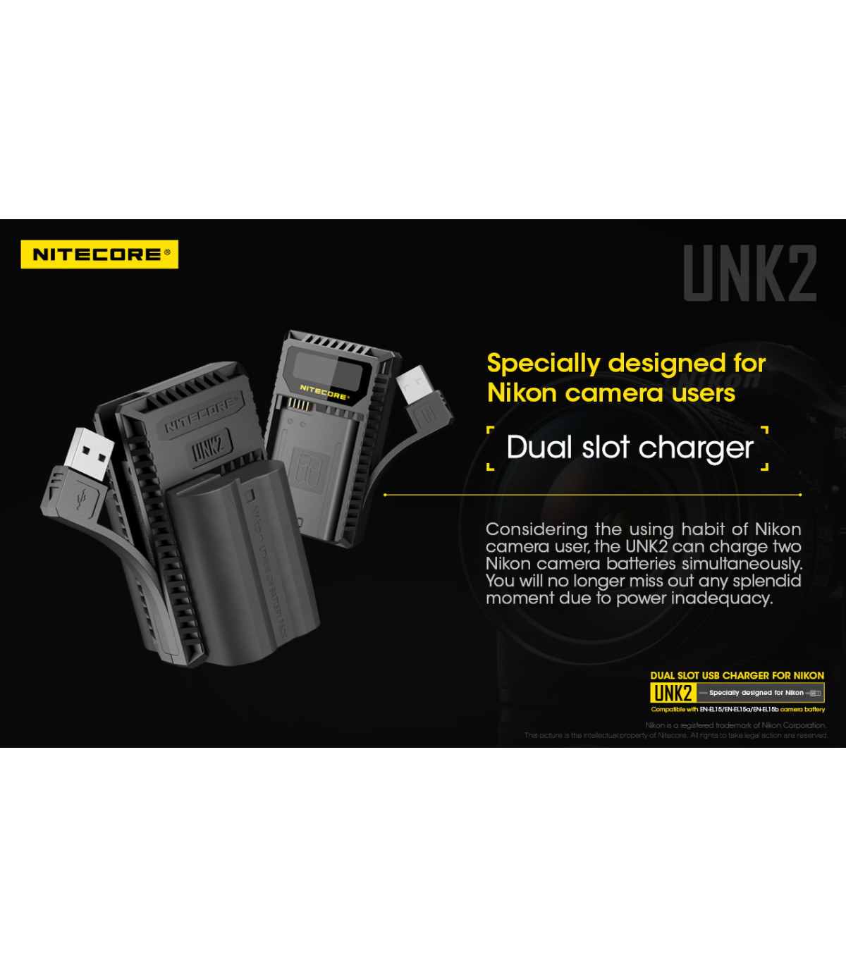 Έχοντας λάβει υπόψη τις συνήθειες των χρηστών φωτογραφικών μηχανών Nikon, ο UNK2 μπορεί να φορτίσει δύο μπαταρίες ταυτόχρονα.