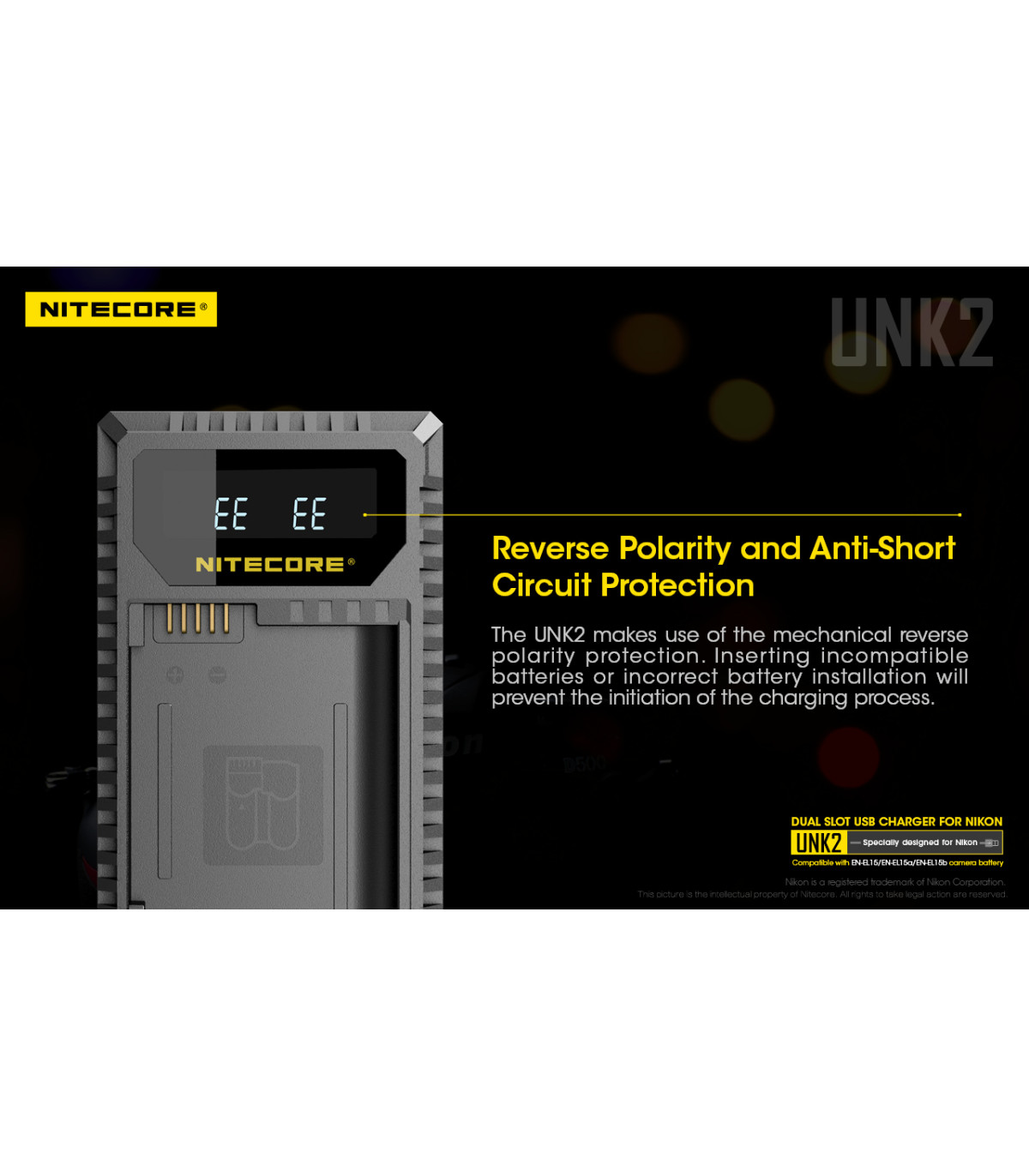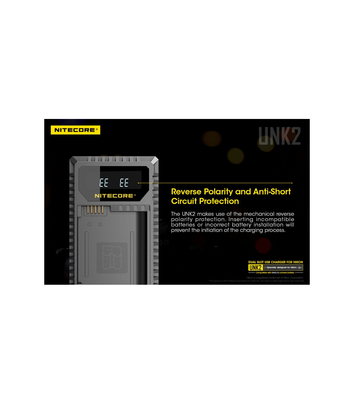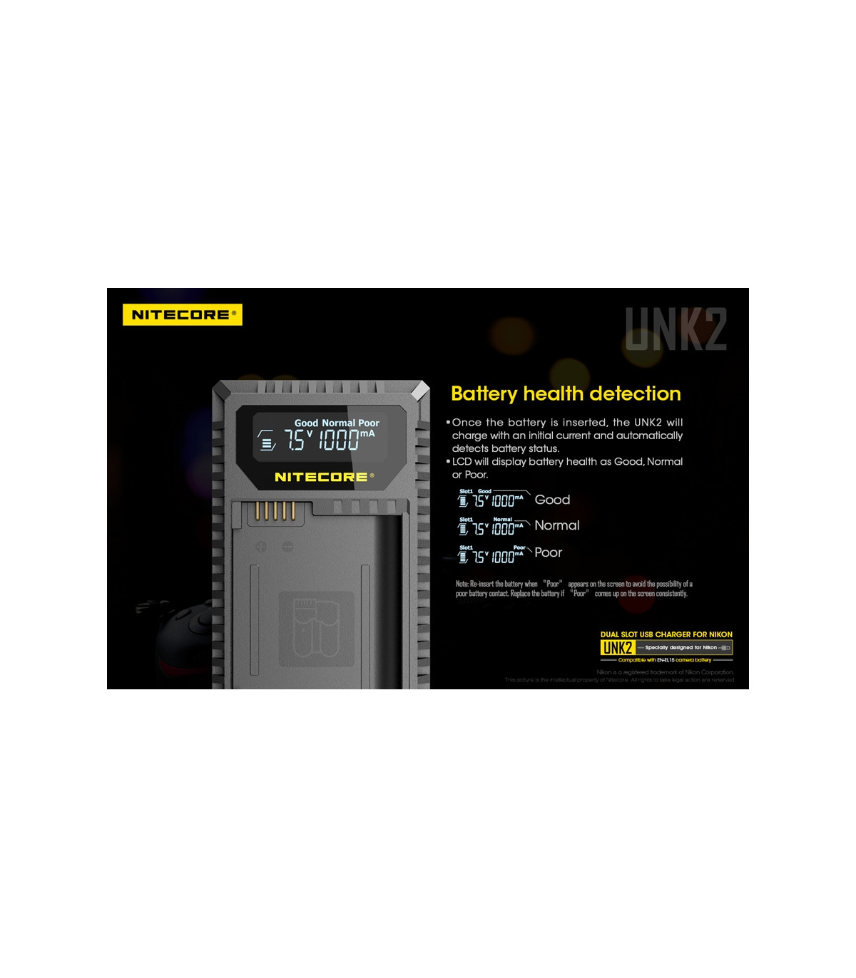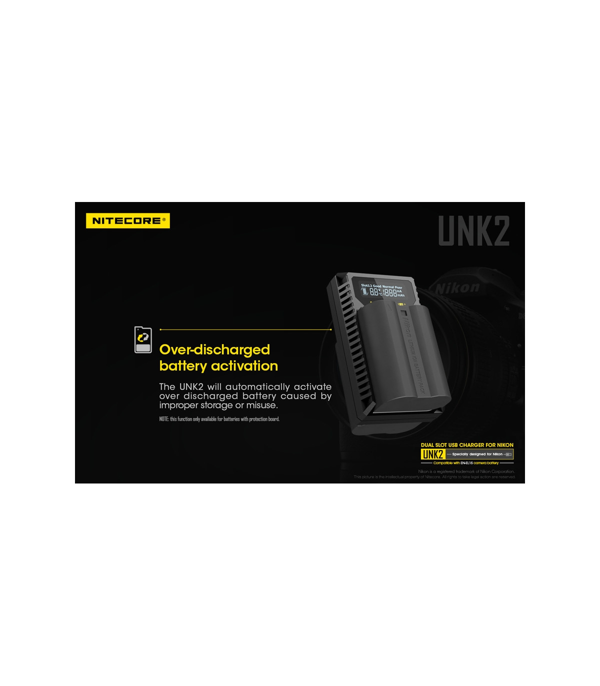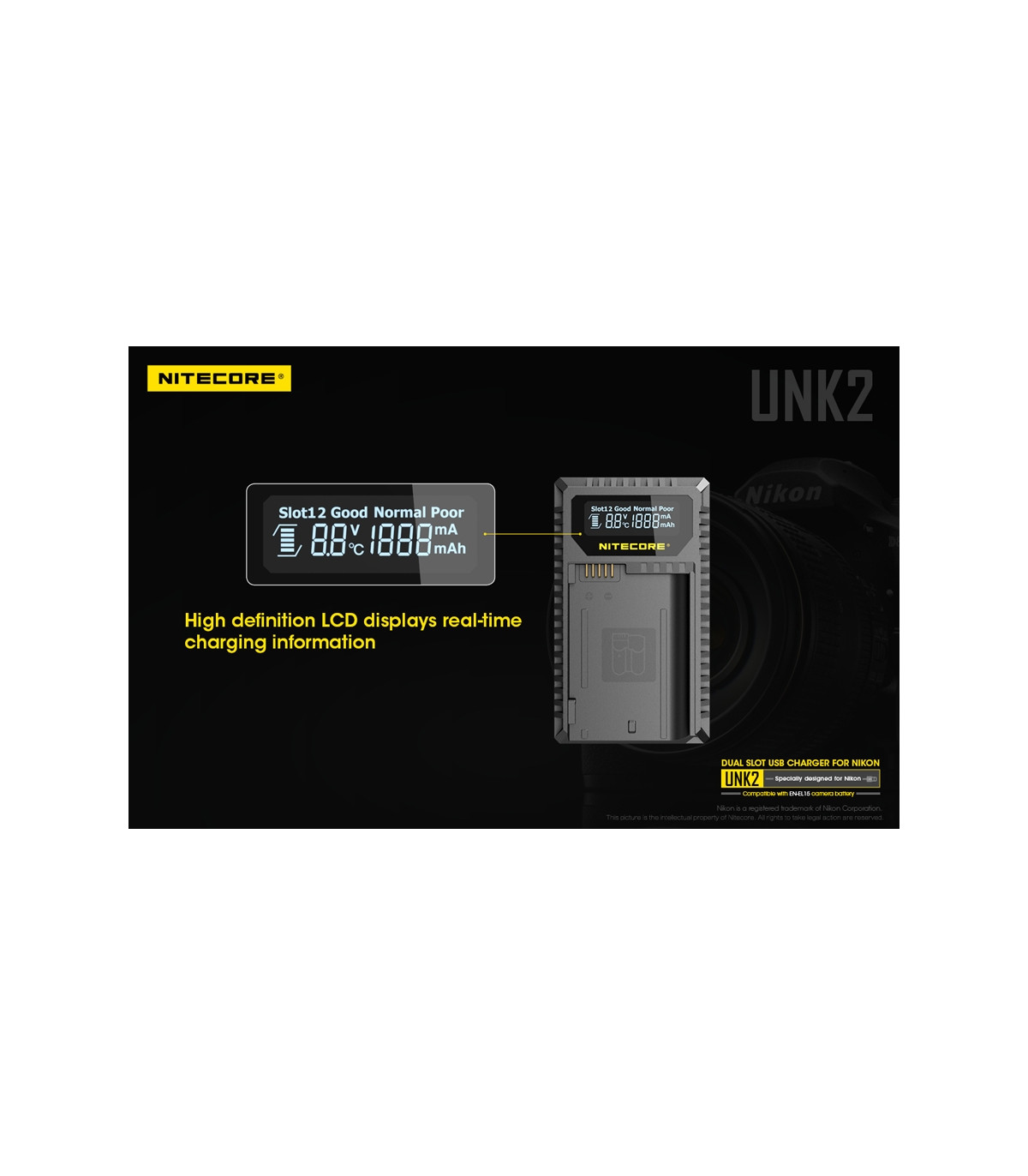 Έχοντας λάβει υπόψη τις συνήθειες των χρηστών φωτογραφικών μηχανών Nikon, ο UNK2 μπορεί να φορτίσει δύο μπαταρίες ταυτόχρονα.