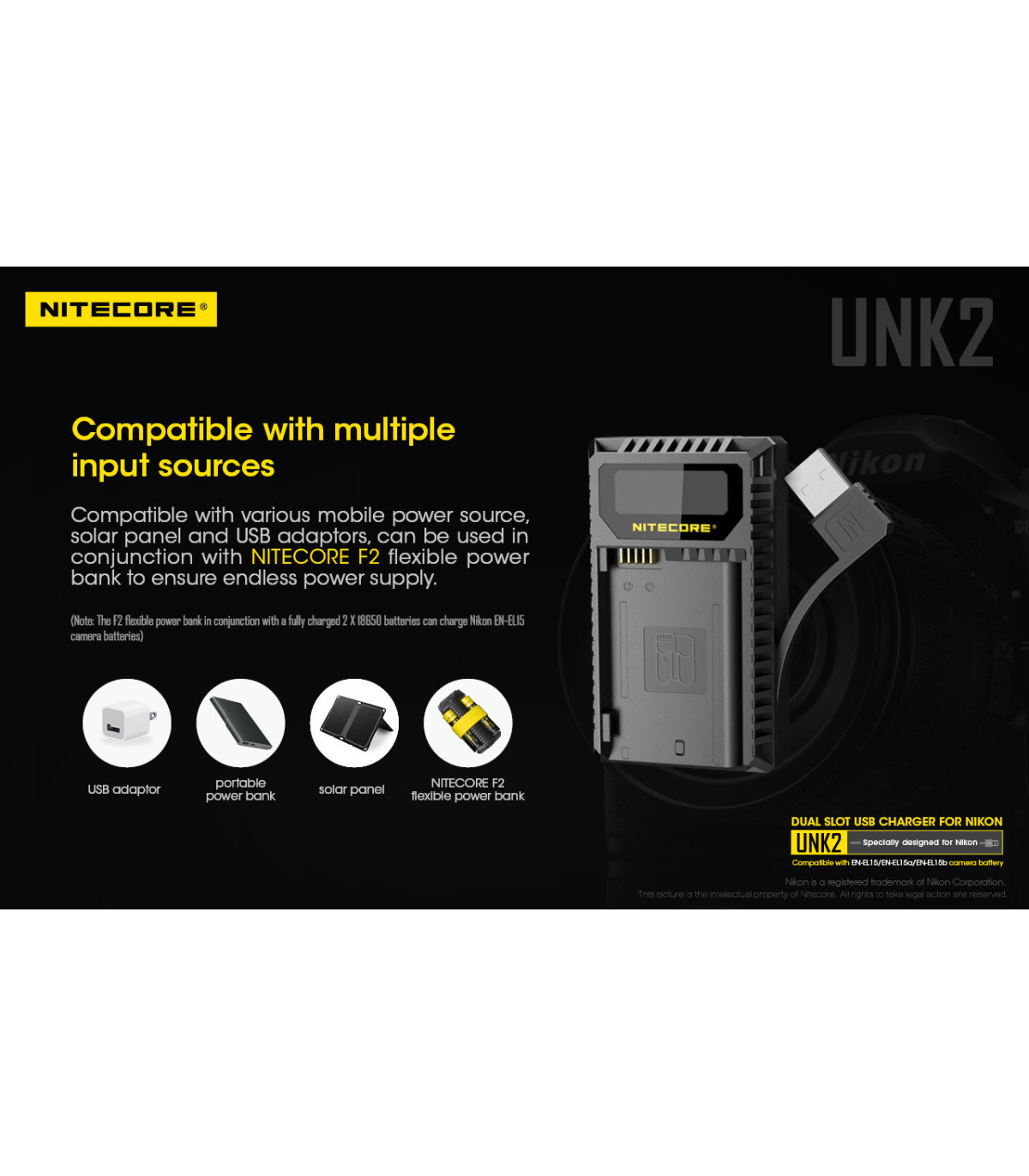 Είναι συμβατός με πολλά είδη παροχής ενέργειας όπως αντάπτορ ρεύματος με έξοδο USB, φορητές αποθήκες ενέργειας (Power Bank), ηλιακά panel, τον φορτιστή / απο-φορτιστή F2 της NITECORE.