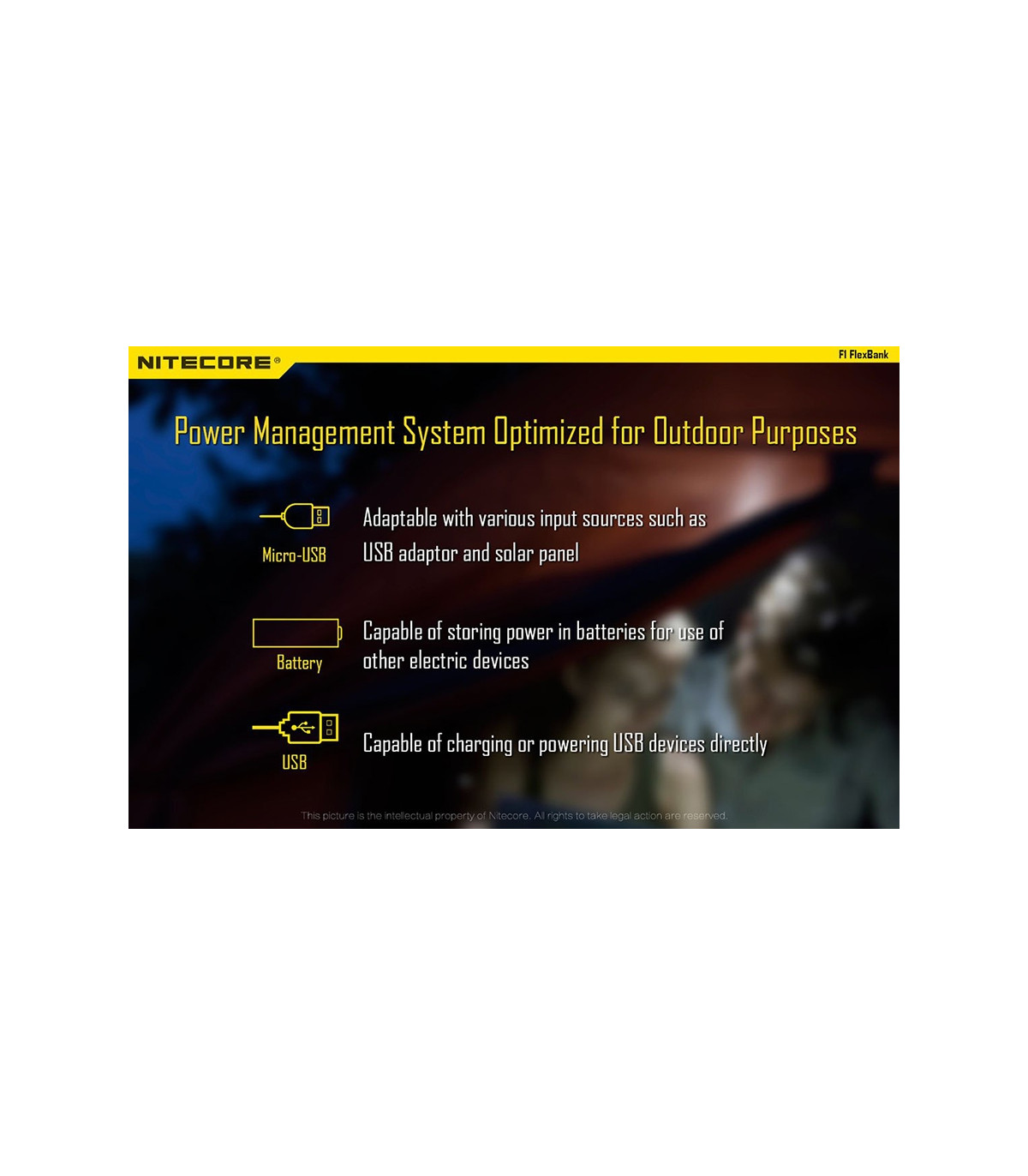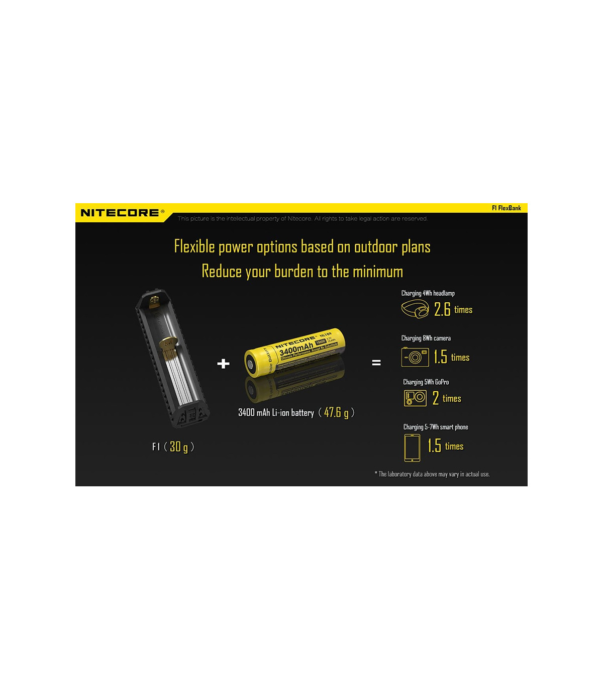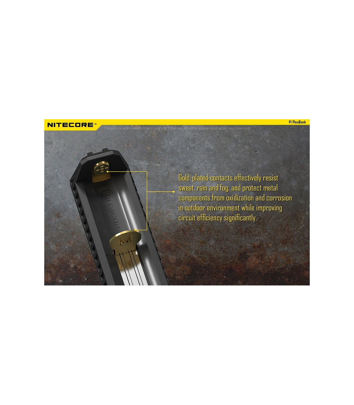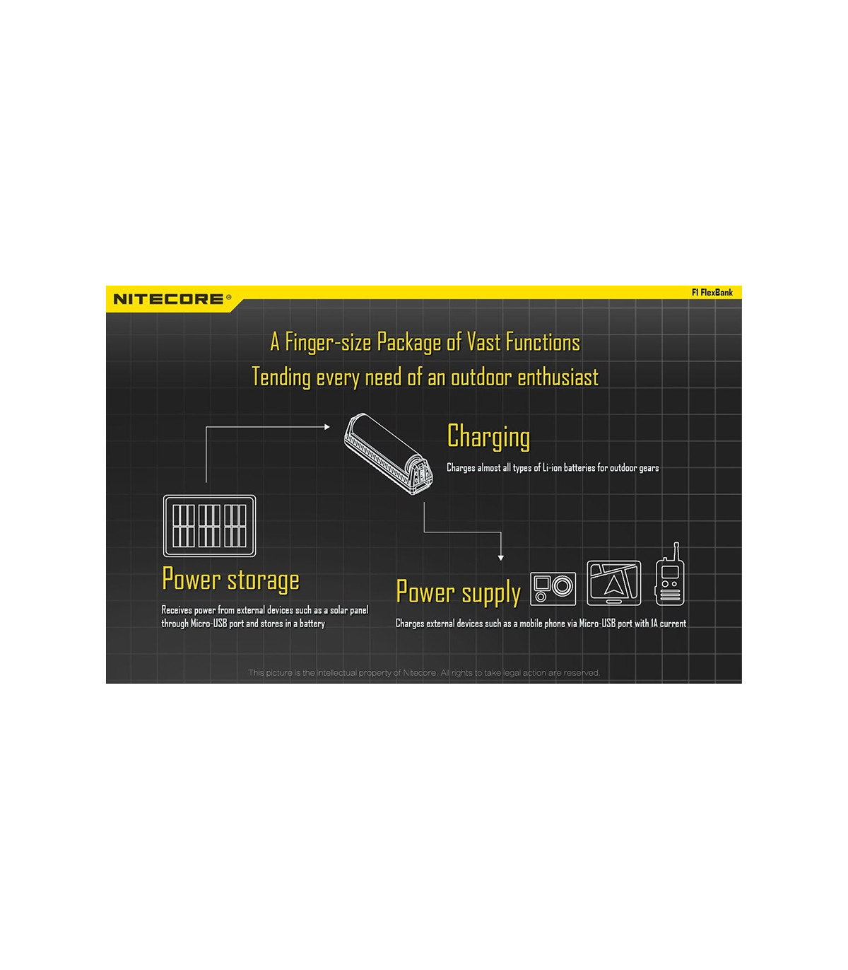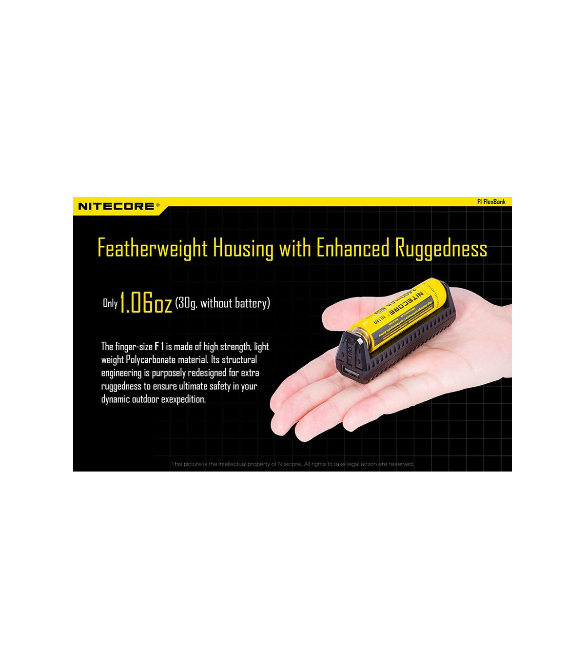 Εύχρηστος, πολυχρηστικός φορτιστής μίας θέσης της Nitecore. Φορτίζει από USB και μπορεί να δώσει το ρεύμα της μπαταρίας για φόρτιση άλλης συσκευής (power bank). Σχεδιασμένος για εξωτερικές δραστηριότητες, μικρός, ελαφρύς, ανθεκτικός.