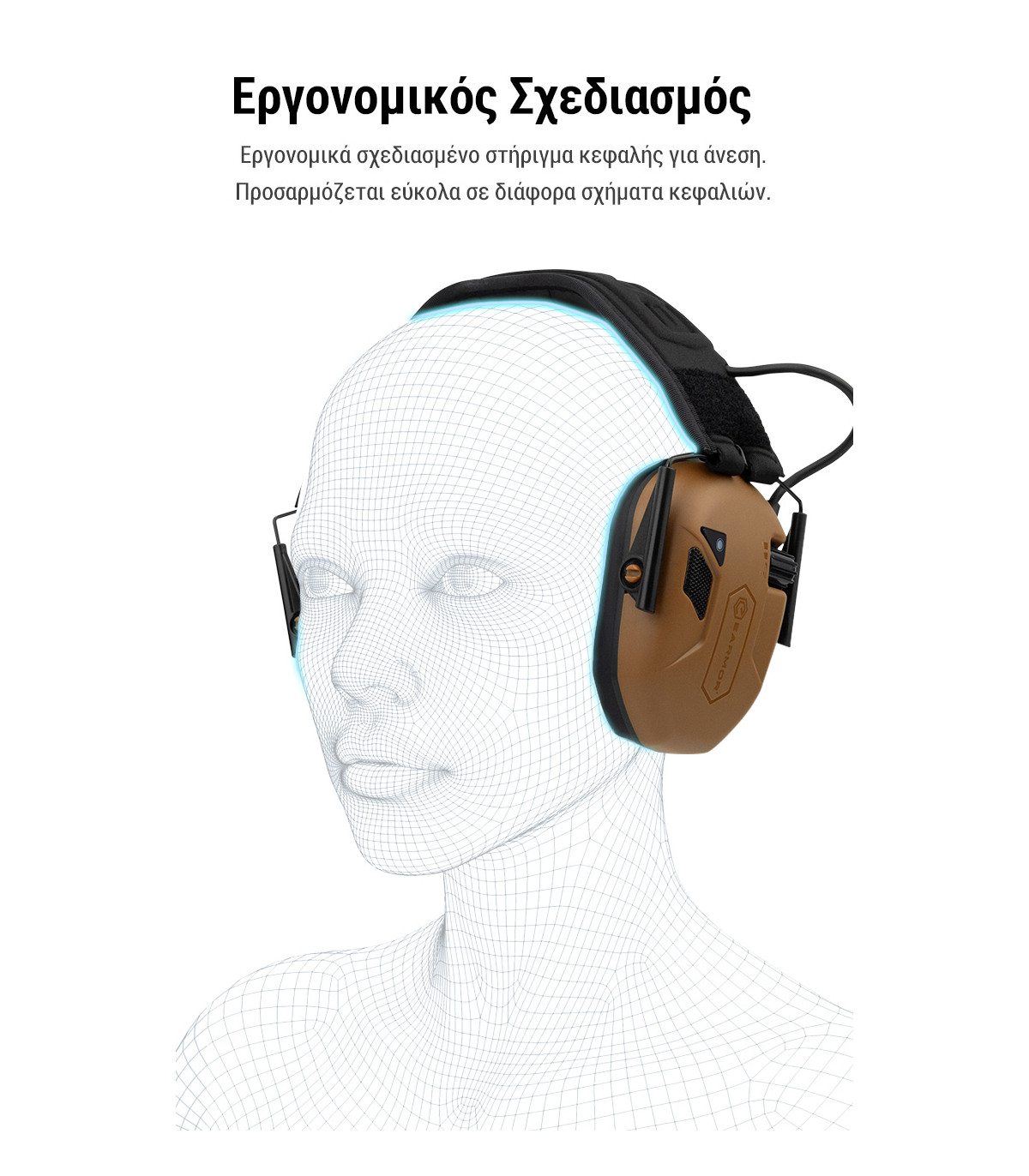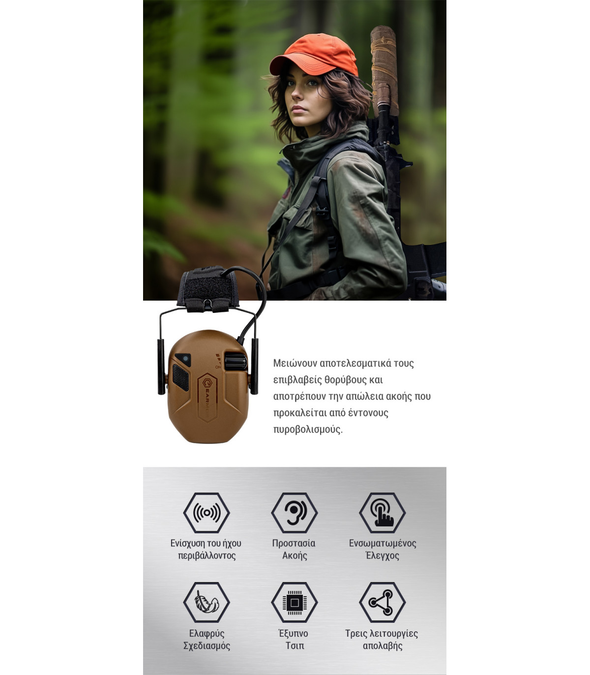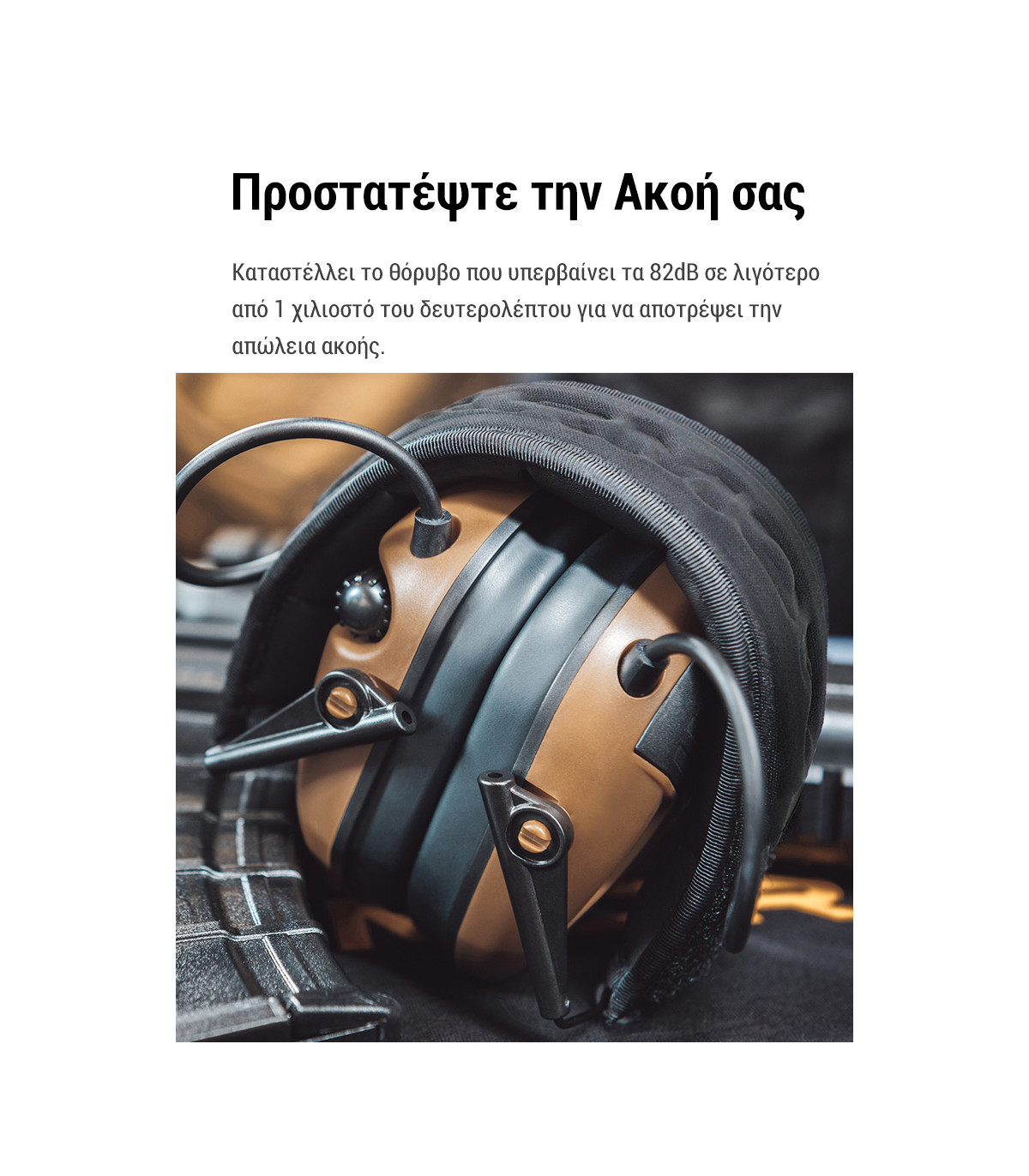 Εξοπλισμένες με ένα ενσωματωμένο τσιπ που χρησιμοποιεί προηγμένη τεχνολογία επεξεργασίας ψηφιακού σήματος, μειώνουν αποτελεσματικά τον ένταση του ήχου σε θορυβώδη περιβάλλοντα και ελαχιστοποιούν τη ζημιά που προκαλείται στην ακοή από τον ήχο των πυροβολισμών .