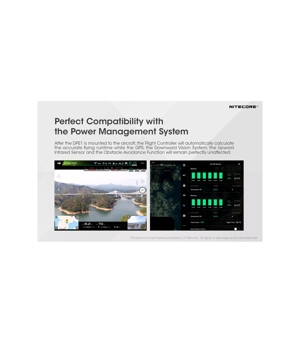 Μετά την τοποθέτηση του DPE1 στο Drone, ο ελεγκτής της πτήσης θα υπολογίσει αυτόματα τον ακριβή χρόνο πτήσης ενώ παράλληλα το GPS, το σύστημα κάθετης ορατότητας, ο υπέρυθρος αισθητήρας και η λειτουργία αποφυγής εμποδίων θα παραμείνουν τελείως ανεπηρέαστα.