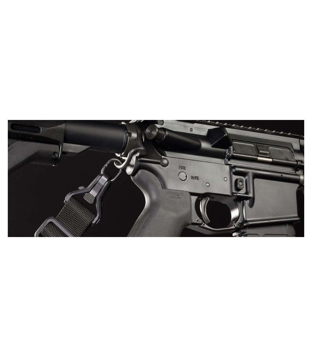The ASAP Ambidextrous Sling Attachment Point allows a range of motion greater than 180 degrees, enabling true ambidextrous weapon manipulation for both left and right handed shooters. The ASAP replaces the standard AR15/M4 carbine stock receiver end plate, providing a tactical advantage by minimizing sling snagging and facilitating easy transition to and from weapon and reaction side shoulders. The ASAP works with one-point type slings with snap hook style attachments such as the Magpul MS3.