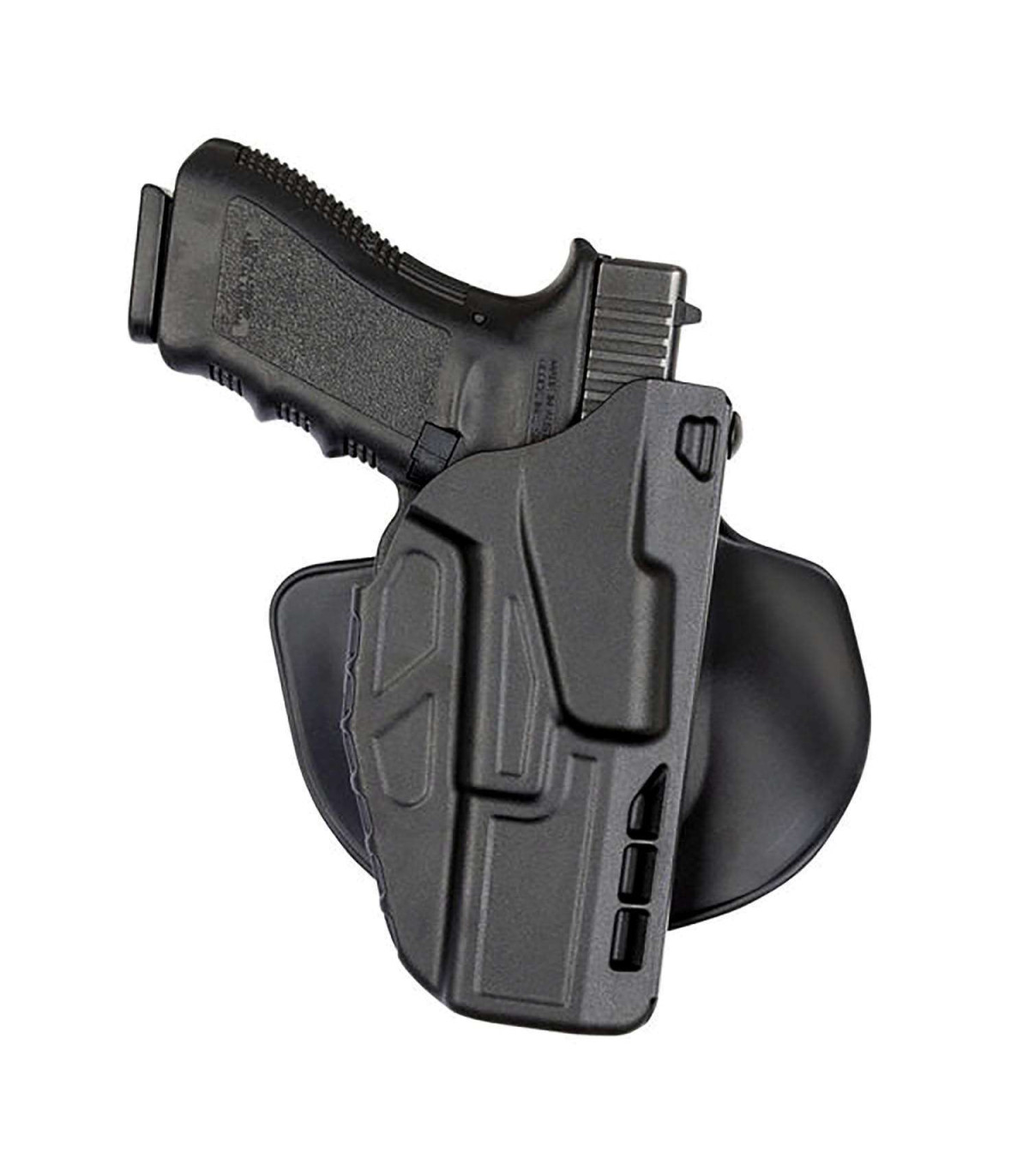 The Safariland® Model 7377 7TS Holster combines the security of ALS® with the speed and simplicity of an open-top design. ALS® secures your weapon automatically as it is holstered, yet still allows a fast, natural draw with the swipe of the thumb release as you acquire your shooting grip. Built from durable, weather- and temperature-resistant SafariSeven non-marking nylon blend, the Model 7377 7TS will not scratch or mar the finish of your firearm, and its raised interior stand-offs allow dirt and moisture to clear quickly. Features