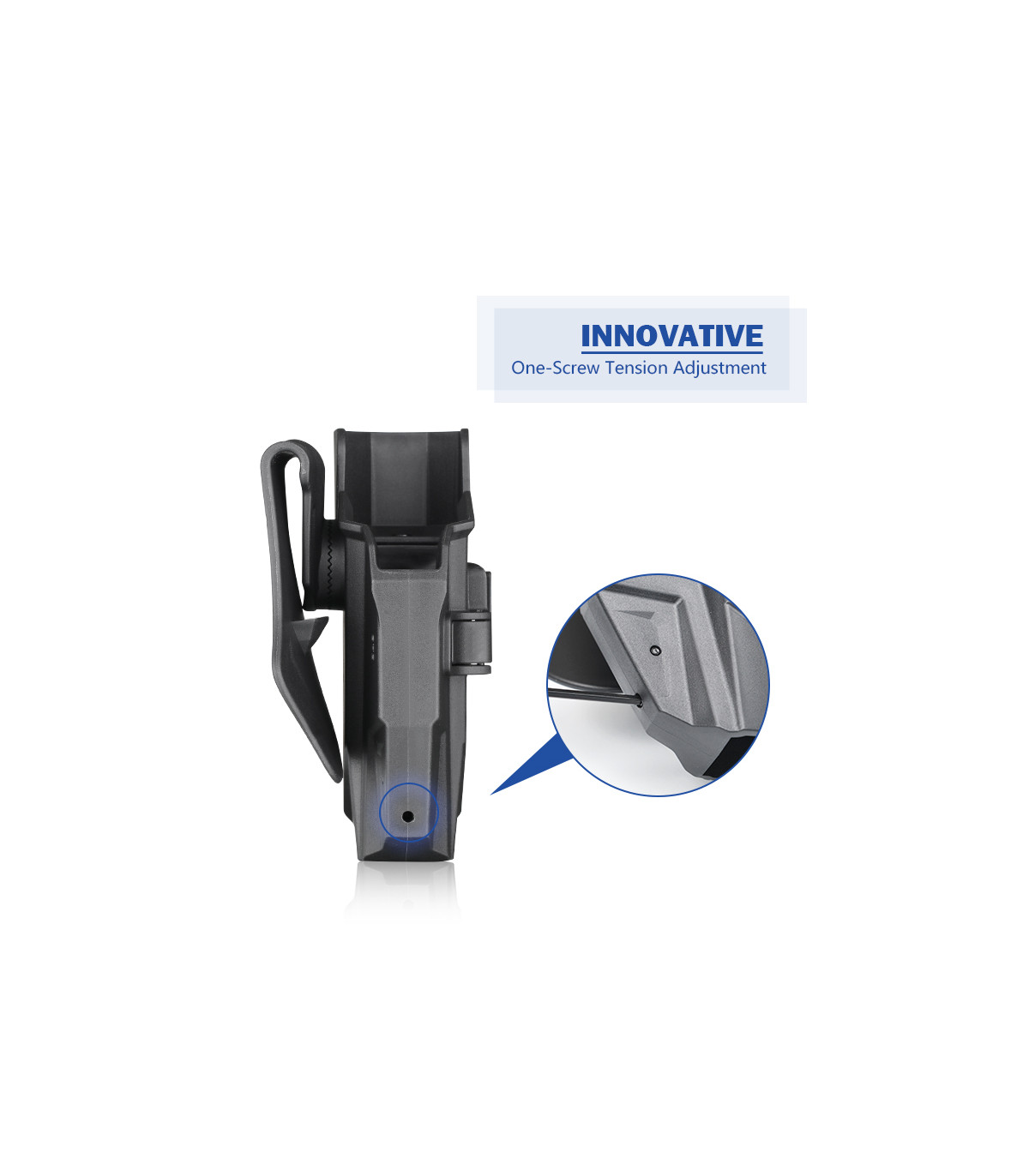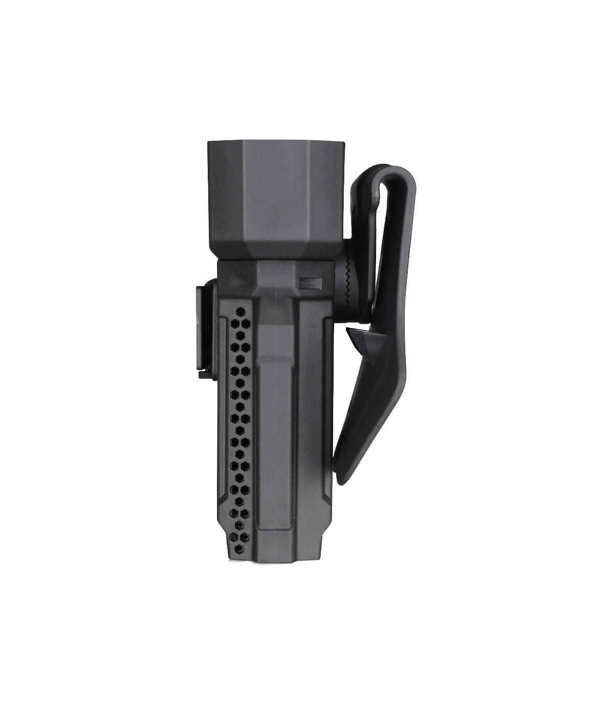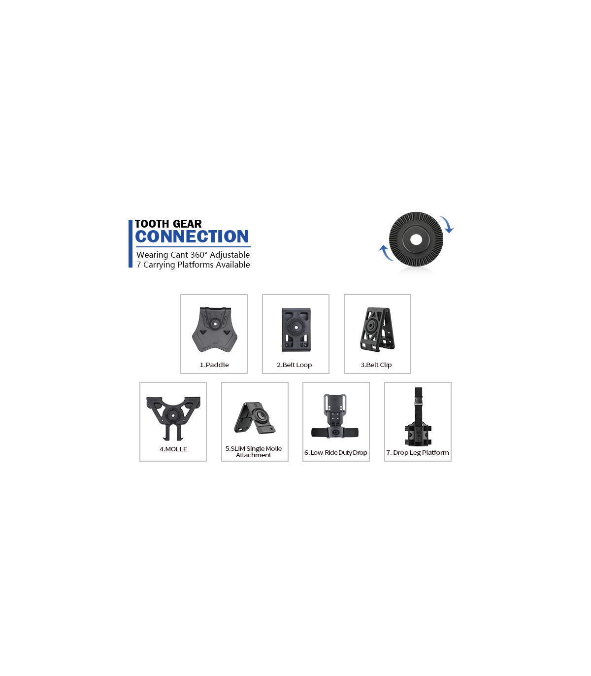 Αυτή η θήκη είναι συμβατή με 7 διαφορετικές πλατφόρμες μεταφοράς με οδοντωτό γρανάζι – κουπί, θηλιά ζώνης, κλιπ ζώνης, σύστημα MOLLE, προσαρμογέας γρήγορης απελευθέρωσης κ.λπ. Μπορείτε να ρυθμίσετε την κλίση κατά 360 μοίρες.