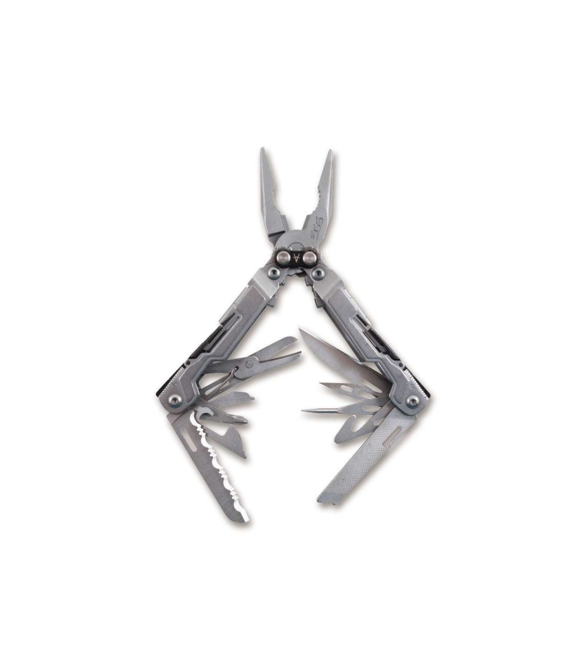 The SOG PowerPint is a fully equipped multi-tool that surprises with its light weight of 119 g given the wide range of functions and sturdy construction. The pliers head with powerful gear rim has flat front jaws to work as needle-nosed pliers, then the gripper for working with hex screws, pipes and cap nuts and lastly hard and soft wire cutters. The 16 locking tool functions also include: Serrated sheepsfoot blade (5.7 cm), scissors; line cutter, Phillips screwdriver #1, awl, jewelry driver, small flat screwdriver, file, hex bit driver (1/4"), ruler (inch/cm), can and bottle opener.
