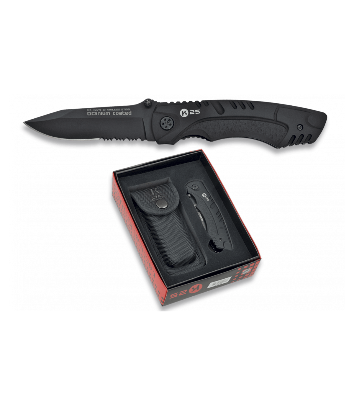 Επιχειρησιακός σουγιάς τσέπης, με οδοντωτή κατά το ήμισυ λάμα με επίστρωση Τιτανίου και θήκη cordura.