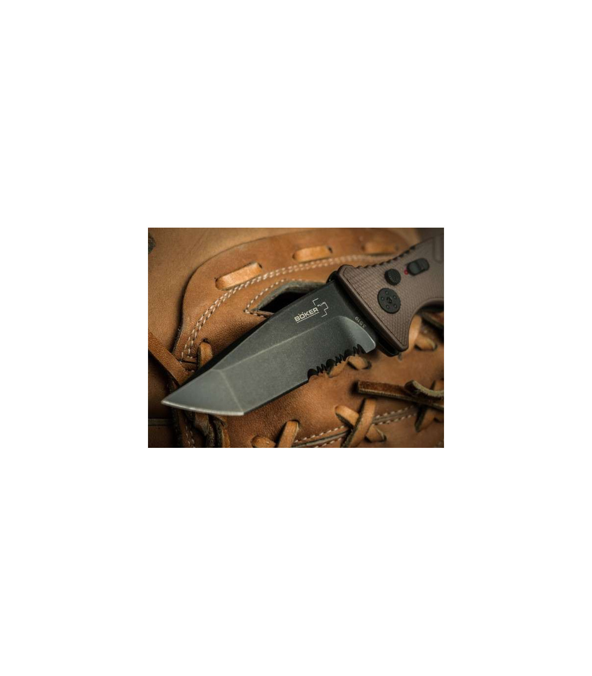 The Boker Plus Strike is a robust switchblade for everyday use which rounds out our wide selection of automatic knives. The slender handle is built around steel plates which are covered with light-weight coyote aluminum scales with a milled surface for better grip. Deep grooves in the well-defined thumb rise aid safe handling. A cleanly latching safety slide against accidental triggering acts as additional security when the knife is closed. The Tanto blade with partial serration is made from the Japan-developed AUS-8 and provided with a Black Stonewash Finish. With reversible clip (tip-up / tip-down).