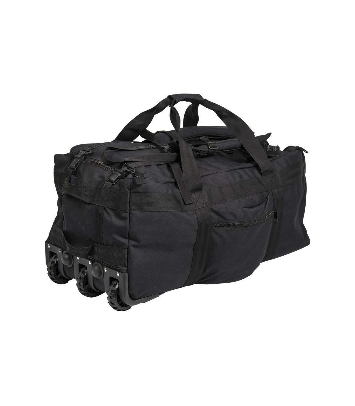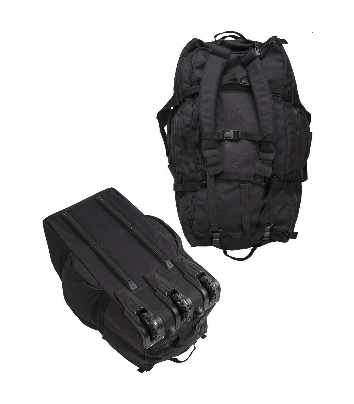Big travel bag, which is also usable as a backpack. It features a big main pocket with 5 inside pockets with zipper. 2 pockets on the side with zipper. 3 plastic rolls on the bottom enables a slightly transportation. Protected bottom area by plastic nubs and bottom reinforcement. Good stability by plastic on the side. Removeabe backpack straps. Reinforced carrying handle. 4 handles on the side. Compression straps with stuck fastener. Big pocket with hook and loop closure on top