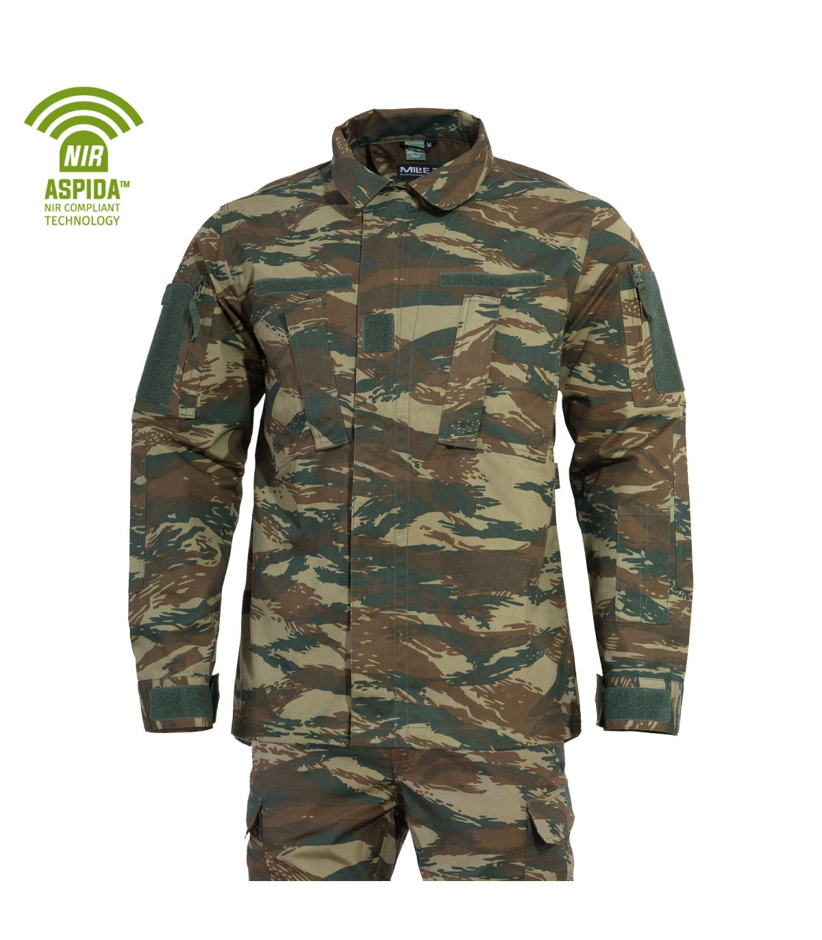 Νέα ειδική έκδοση της στολής ACU 2.0 με την κωδική ονομασία "MILES" σύμφωνα με τις επίσημες προδιαγραφές του Ε.Σ. προσφέροντας ιδιότητες NIR (Near Infrared) προστασίας μέσω του  συστήματος ASPIDA™ αλλά και νέα σύνθεση υφάσματος με βάση το οργανικό βαμβάκι CVC. Πρόκειται για ειδική επεξεργασία του νήματος του υφάσματος μέσω της οποίας επιτυγχάνεται η μέγιστη καλυπτική δυνατότητα κατά της υπέρυθρης απεικόνισης. Με τη διαδικασία συγχρονισμού του νήματος στο εύρος φάσματος που εφαρμόζεται η υπέρυθρη απεικόνιση μπορούμε να πετύχουμε υψηλή καλυπτικότητα σε μεγαλύτερο διάστημα αλλά και έπειτα απο διαρκή χρήση και πολλαπλά πλυσίματα.Η επξεργασία του νήματος καλύπτει τις παρακάτω κατηγορίες NIRVISSWIRIRALWIRΠΡΟΔΙΑΓΡΑΦΕΣACU 2.0 "MILES" Χιτώνιο:225γρ. υψηλής πυκνότητας CVC Ripstop ύφασμα80% Βαμβάκι - 20% ΠολυέστεραςΥδατοστεγές ύφασμαΕπανασχεδιασμένος γιακάς πολλαπλής χρήσηςΤριπλή ραφή σε όλα τα σημεία πίεσηςΕιδική διαμόρφωση με πιέτες στη περιοχή της πλάτης για εξαιρετική ελευθερία κίνησεωνΕπανασχεδιασμένες πλάγιες τσέπες στήθους σφραγιζόμενες για μεγαλύτερη ασφάλειαΕνίσχυση διπλού υφάσματος στους αγκώνες για προστασίαΣημεία χρατς τοποθέτησης σημάτων, ονόματος και βαθμού σε στήθος και χέριαΡυθμιζόμενο πλάτος μανίκιώνΕύκολη προσαρμογή μανικιών Θερινής περιόδουΚεντρικό φερμουάρ με ειδικό προστατευτικό ύφασμα  για καλύτερη μόνωσηACU 2.0 "MILES"  παντελόνι  :225γρ. υψηλής πυκνότητας CVC Ripstop ύφασμα80% Βαμβάκι - 20% ΠολυέστεραςΚεντρικό φερμουάρ YKK®Prym® κεντρικό κουμπίΕσωτερικό κουμπί ασφαλείαςΤριπλή ραφή σε όλα τα σημεία πίεσηςΕνισχυμένα φιλέτα στις τσέπες χεριών για προστασία από φθορά κατα την τοποθέτηση αξεσουάρΠροσαρμογή χωρητικότητας τσεπών Cargo μέσω λάστιχων και επιπλέον κουμπιώνΕσωτερικές θήκες επιγονατίδωνΕνισχυμένο ύφασμα σε γόνατα και κάθισμαΈξτρα θήκη για γεμιστήρες ή IFAK στη περιοχή της γάμπαςΙμάντες σύσφιξης στη περιοχή των αστραγάλων