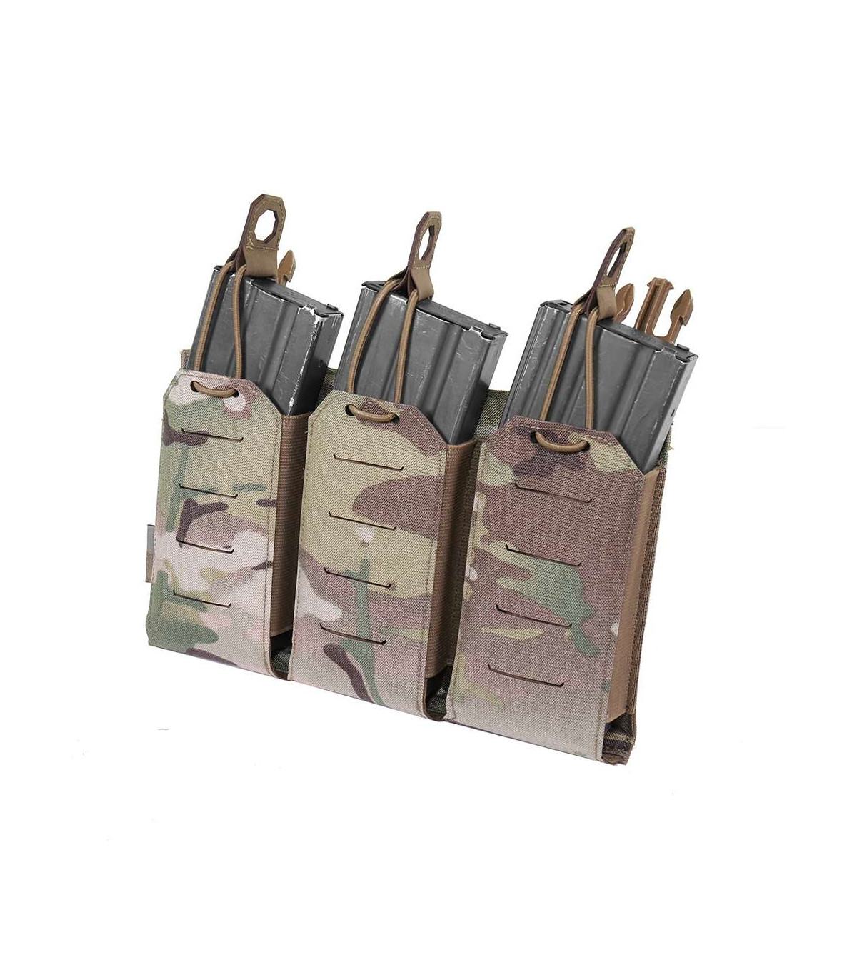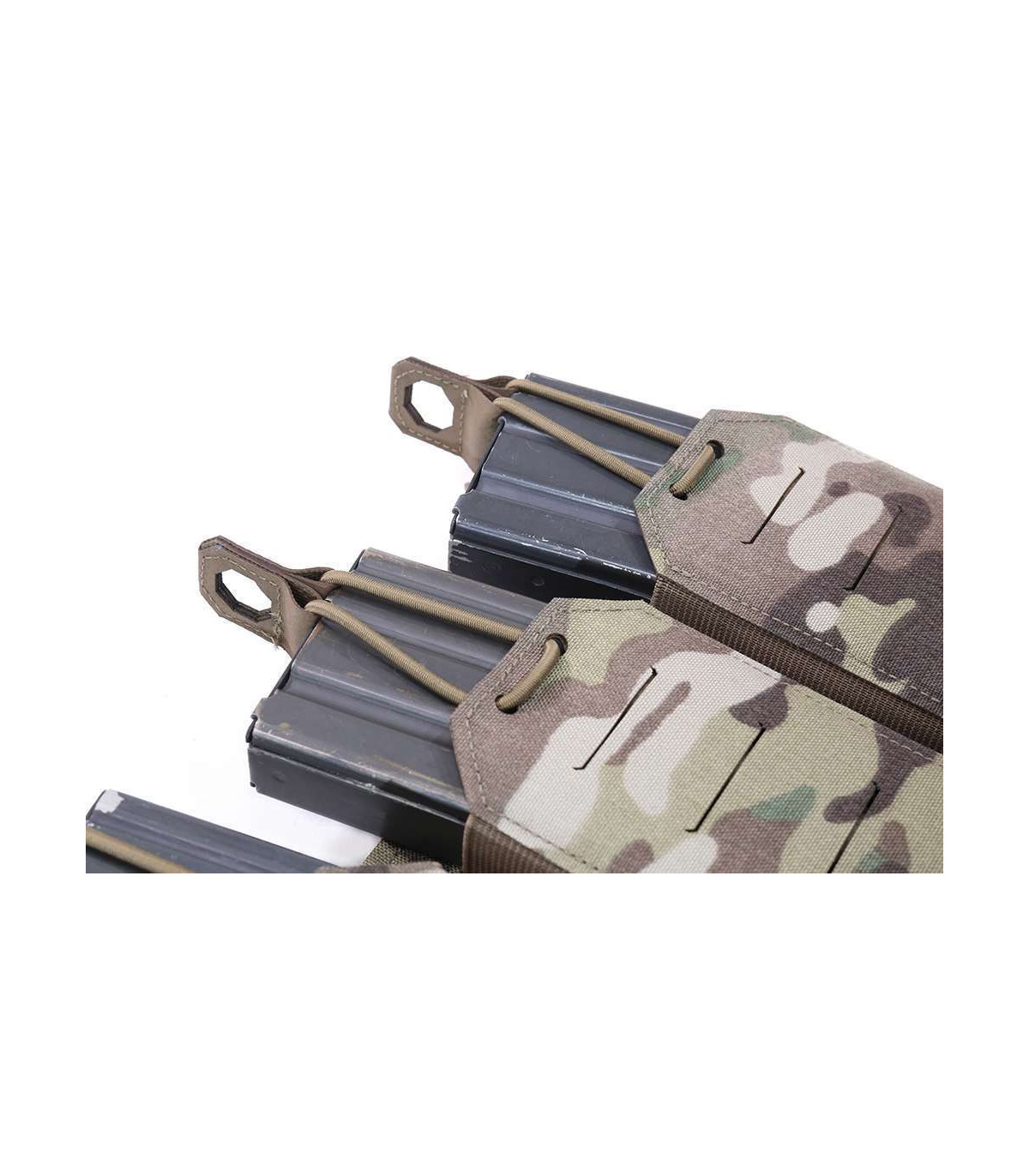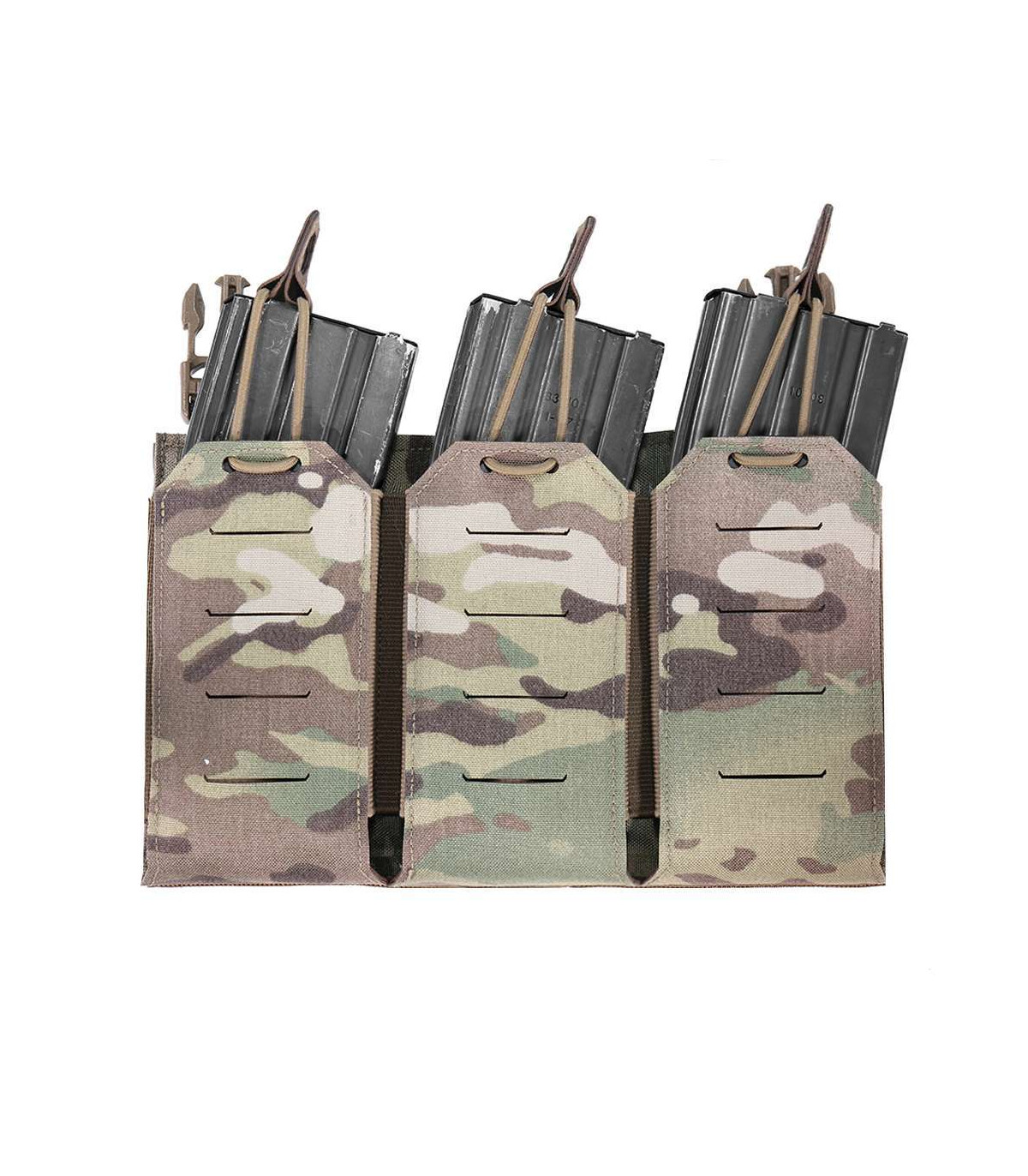 The Laser Cut Detachable Triple 5.56 Mag Pouch is a removable Front Panel which attaches to the front of Warriors Laser Cut LPC Plate Carrier, via Velcro and 2 Vertical SQM clips. The DFP-TB-556P holds 3 x 5.56mm x 45mm mags, and are held in place via bungee retention cord, Hypalon lining provides additional mag retention when bungee safety is removed. Each front panel pouch has 4 MOLLE slots externally, allowing the attachment of additional pouches such as pistol mag pouches, CAT pouch or Multitool pouch.