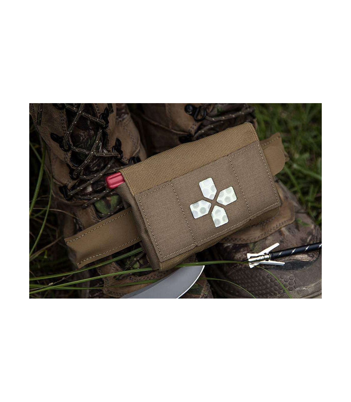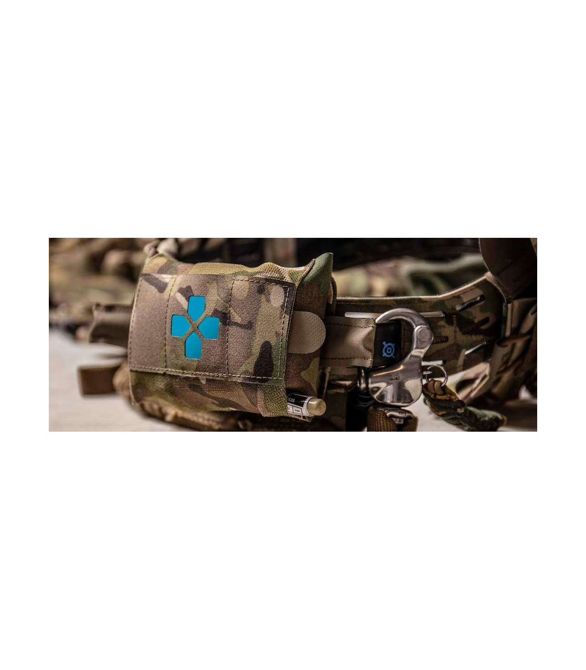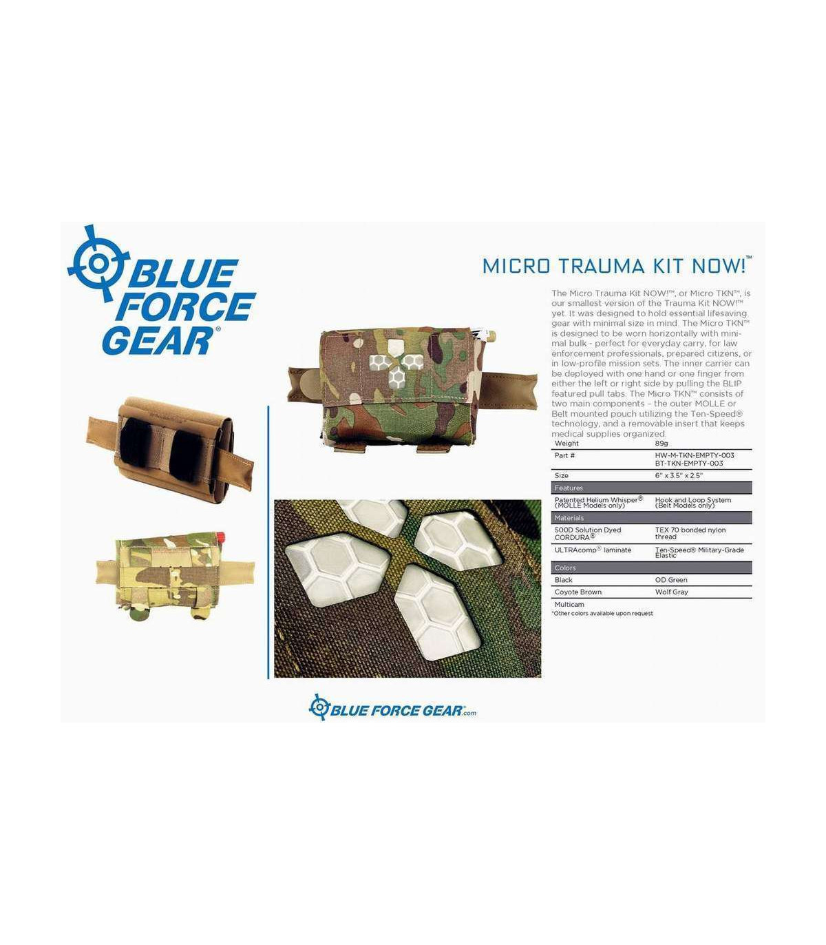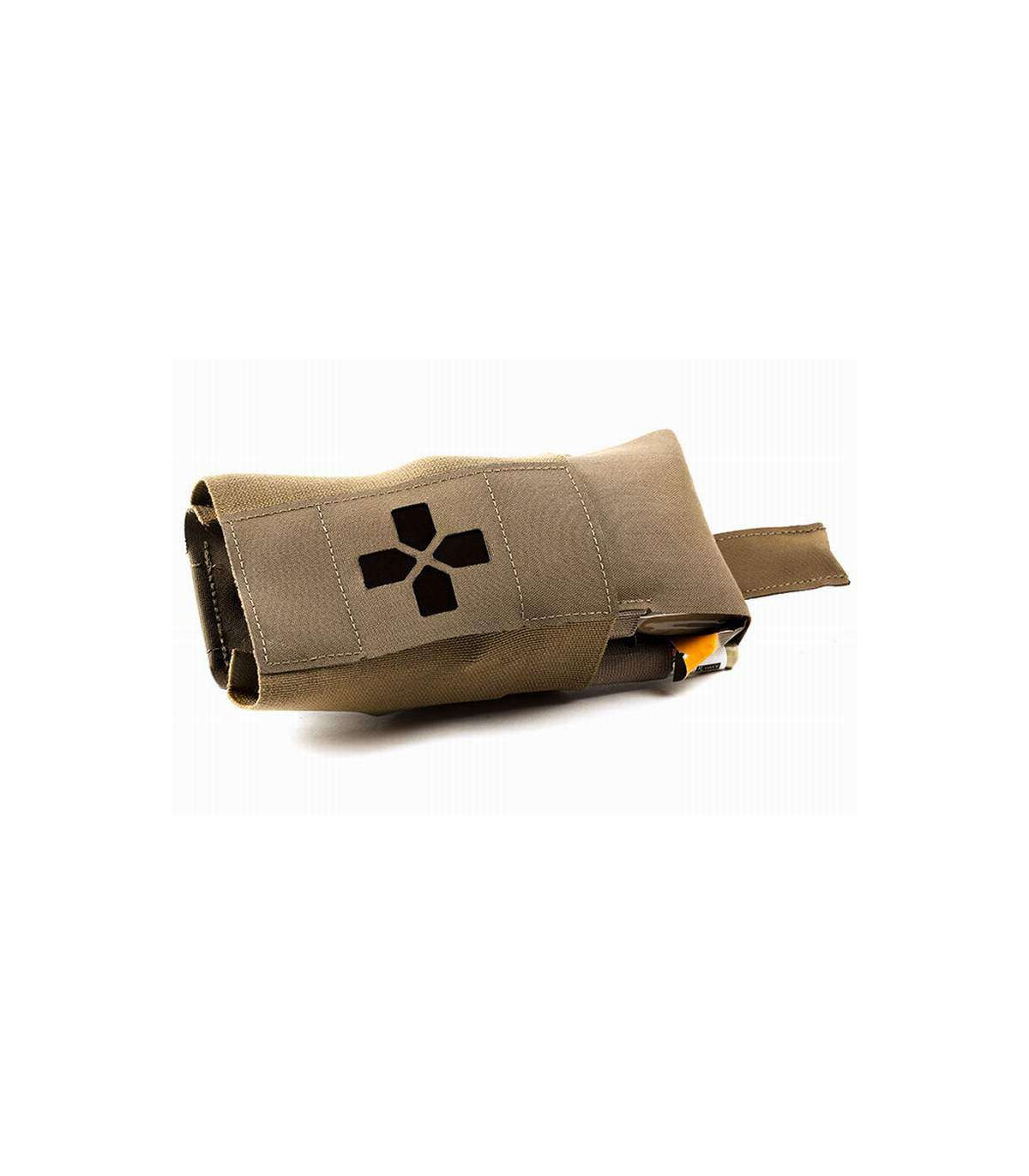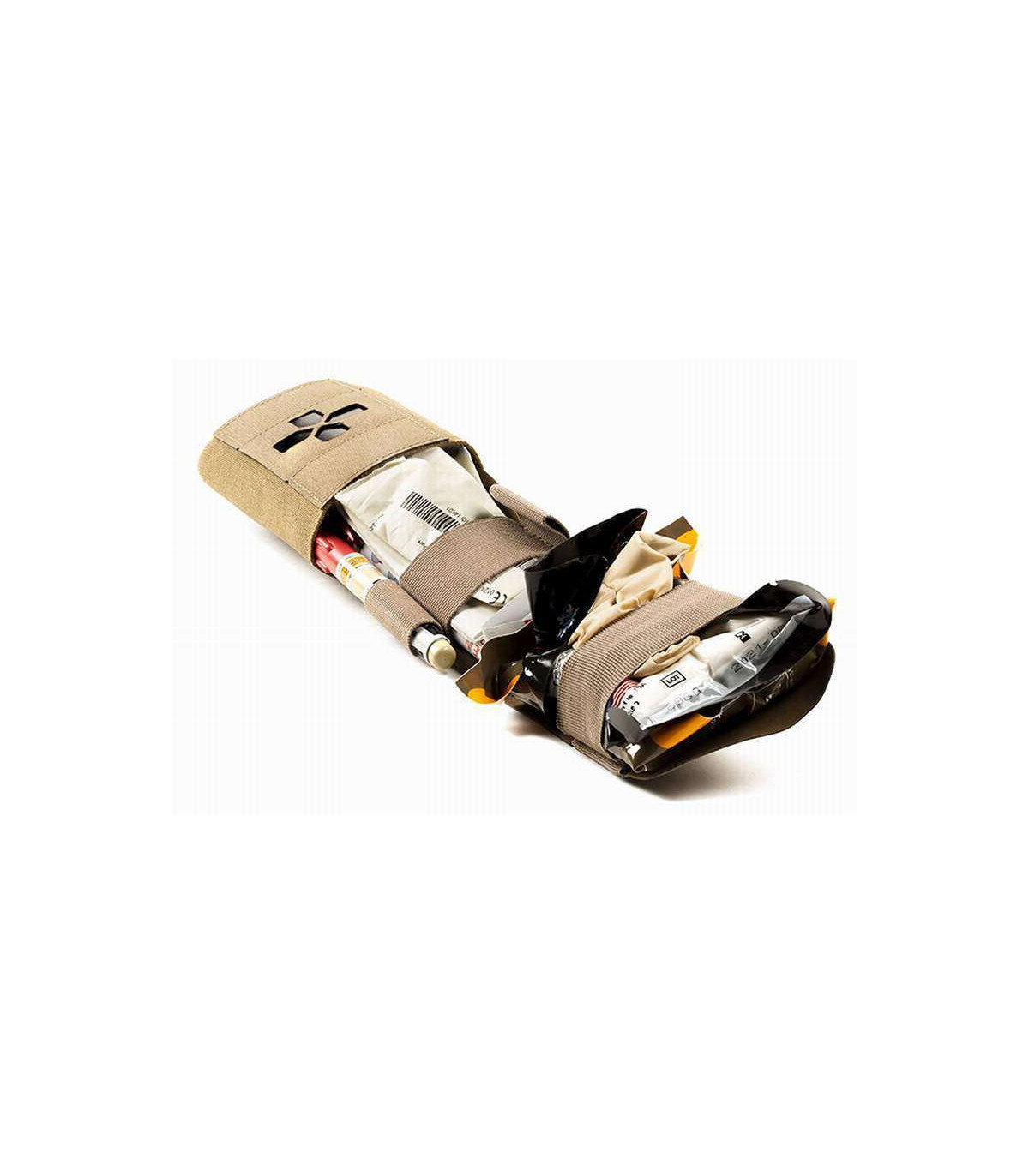 The Micro Trauma Kit NOW!, or Micro TKN, is the smallest version of the Trauma Kit NOW! for every day carry. It is designed to hold essential lifesaving medical supplies on a belt. The Micro TKN was designed as an EDC trauma kit for law enforcement professionals, prepared citizens, or hunters. Deployment of critical first aid supplies can be done with one hand or a single finger from either the left or right side by pulling the BLIP featured pull tabs. The Micro TKN consists of two main components – the outer MOLLE or Belt mounted pouch utilizing the Ten-Speed technology, and a removable insert that keeps medical supplies organized. Deploying critical life saving first aid supplies can be done in seconds by pulling the BLIP featured pull tabs. The Micro Trauma Kit's inner removable insert keeps medical supplies organized and available for instant access. Watch how easy it can be done with this video. The Micro TKN Belt Pouch is available in two attachment / wear methods. The "Belt Pouch" version features two adjustable hook and loop tabs that can fit on almost any belts - from every day pants belts to 2" duty belts. The Belt Pouch version can also be mounted on MOLLE. This Trauma Kit was designed around a specific medical supply load out specifically designed for small form, low bulk applications. We highly recommend purchasing the "filled" kit to get the greatest protection and usability. The front outer pouch features a laser cut cross with several signal indicators - black insert or highly reflective glow-in-the-dark insert. The end user can decide which indicator works best for their use or leave all the inserts out for a pattern matched front for maximum concealability.