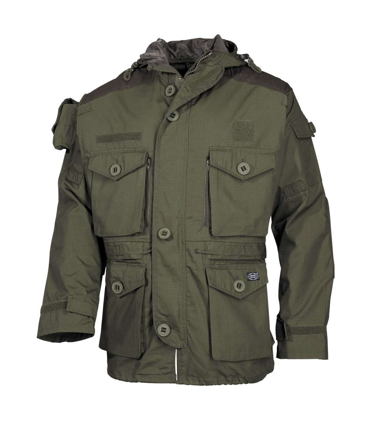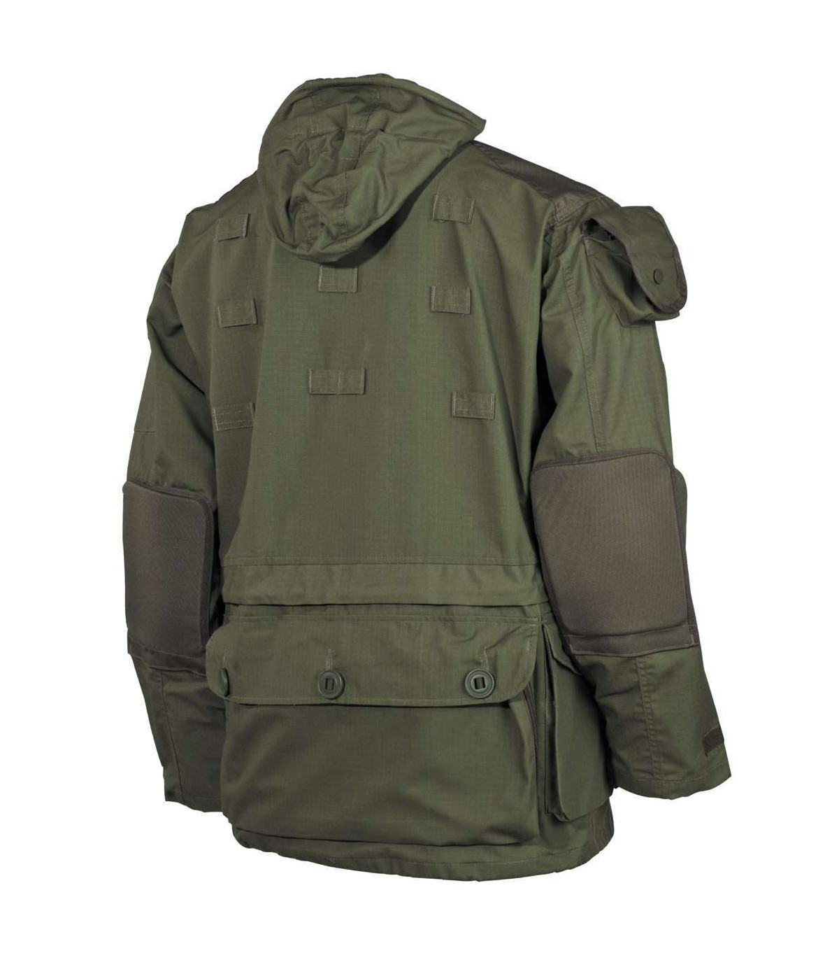 This comfortable and lightweight tactical smock from MFH is made of high-quality Polycotton Ripstop material and features a high collar with integrated wired hood, and a sturdy, two-way front zipper with buttoned weather resistant flap. Moreover, the Commando Smock Jacket goes with multiple pockets and sleeves to meet all the storage needs, reinforced elbow pockets with removable padding, and underarm pit zippers for increased ventilation. Designed to provide perfect protection against wind and water, whatever the weather, this field smock is an ideal choice for all sorts of outdoor activities such as airsoft, hiking, fishing or hunting. Additional details: Reinforced shoulder patches, Hook-and-Loop adjustable cuffs, Front loop strips for IDs or patches, Oversized buttons throughout for added comfort, Internal drawstring with cord locks at waist and hem, Two-way underarm zippers for added ventilation, Multiple loops on the back, front and sleeves, Durable Ripstop fabric. Suits best with MFH commando pants, in olive drab green.