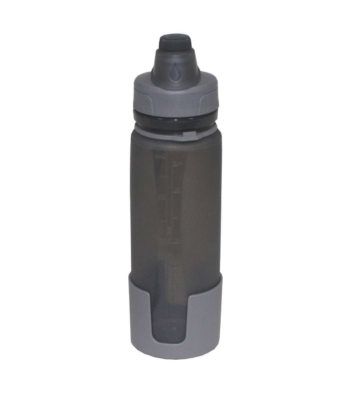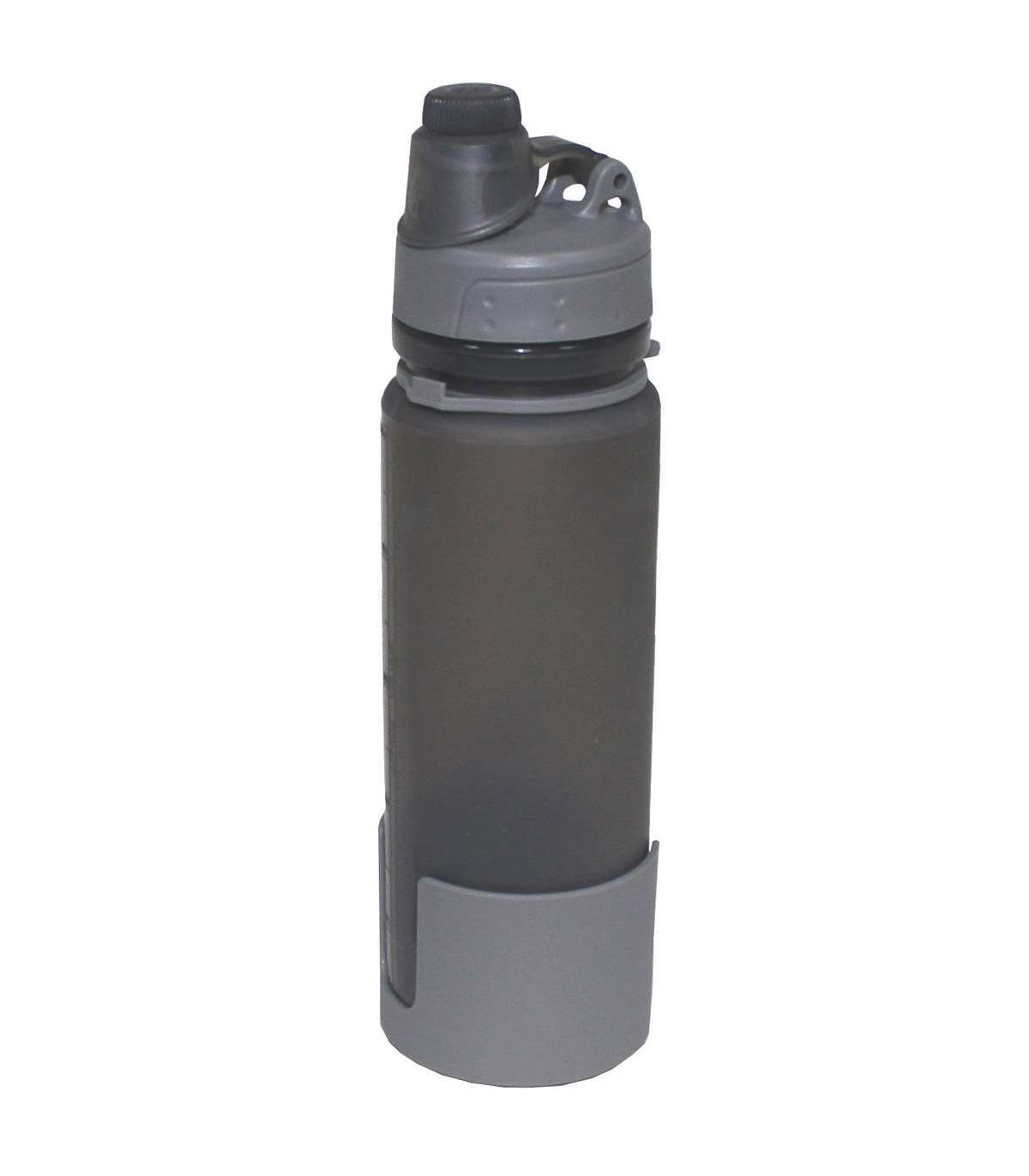 This is a lightweight and rollable bottle which can be compressed to a mini pack size. It is easy to fill and to clean due to a large opening on top. It features a detachable sleeve for stability, a screw cap and a silicone strap for fastening. It is cold and heat resistant and also is a dishwasher safe bottle. Made by odor free and tasteless materials. There is also an ml and oz scale on the side to measure and define the liquid's capacity.