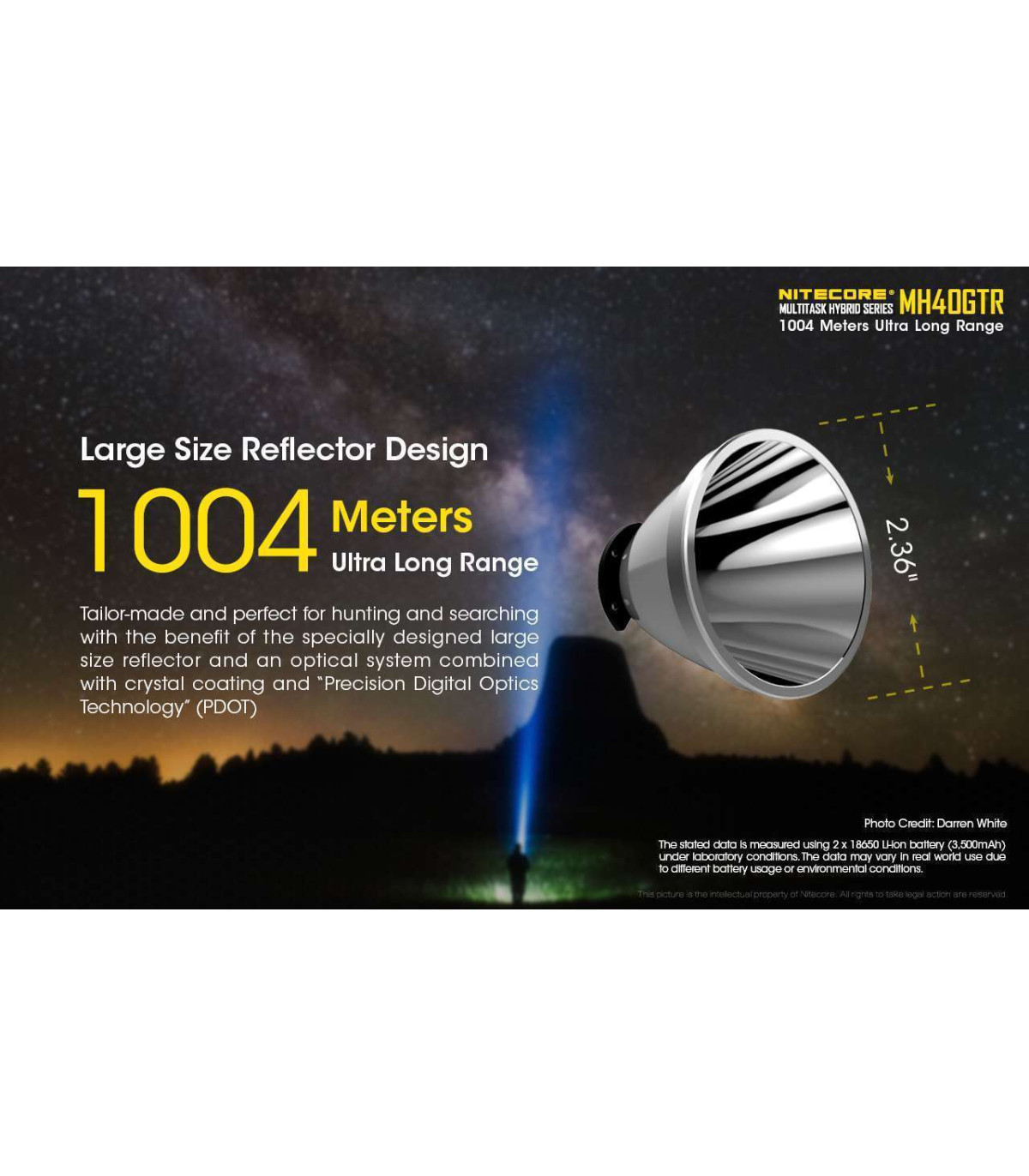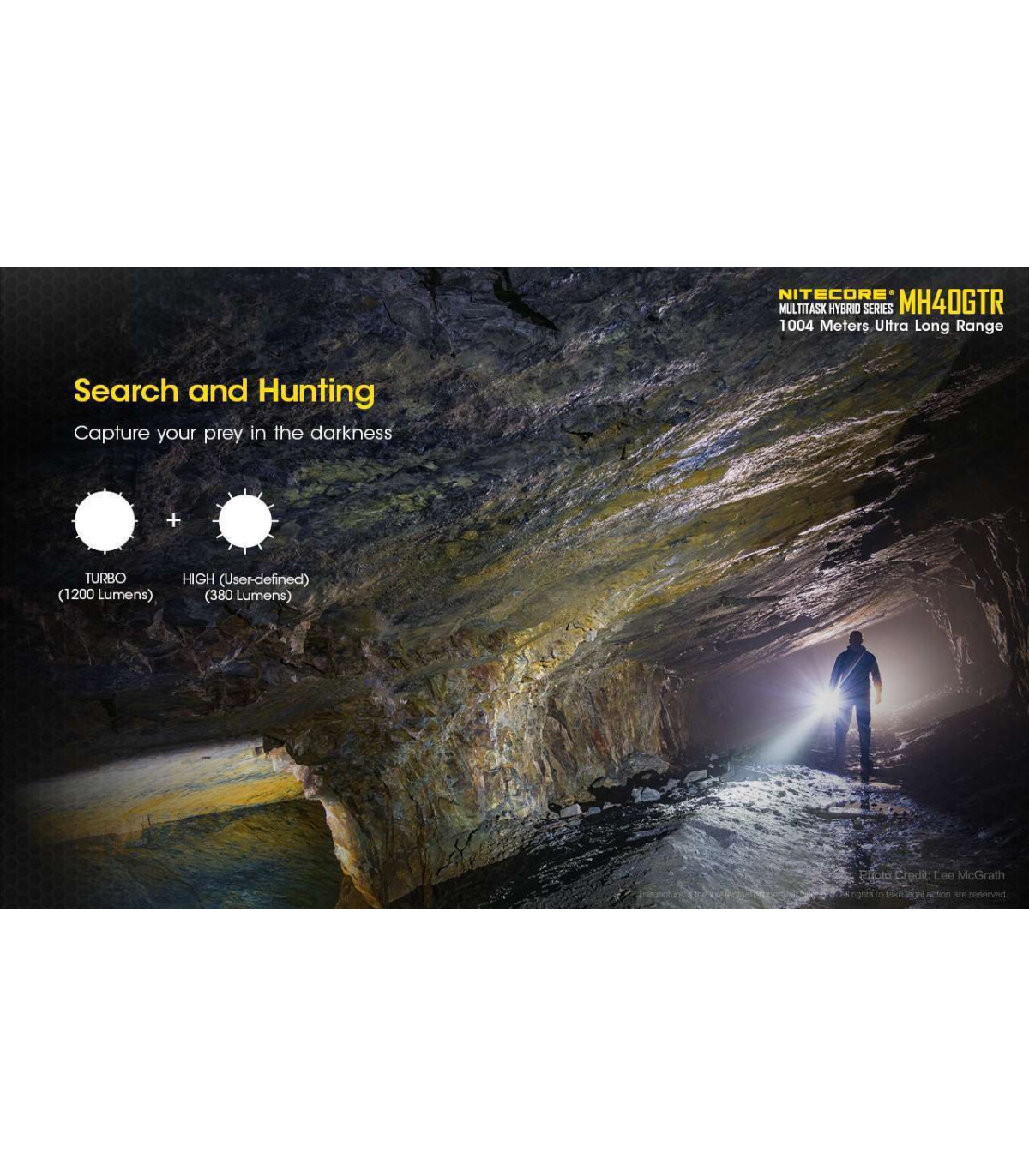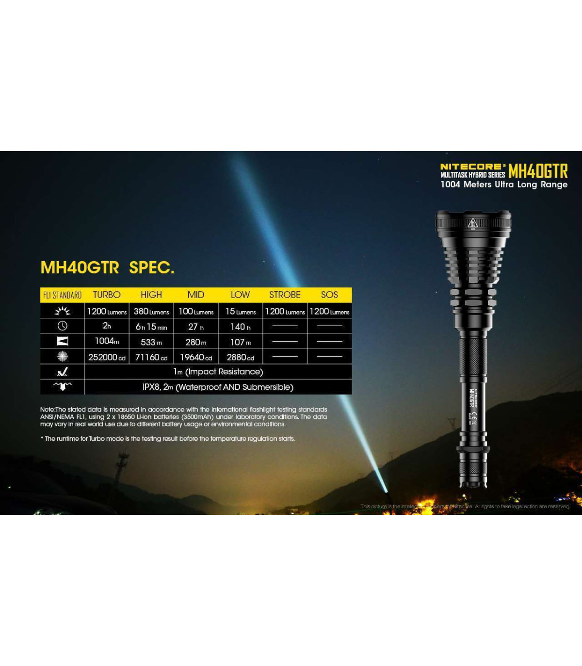 The NITECORE MH40GTR is a high-performance, multi-task hybrid flashlight designed for professional use and rugged adventures. Equipped with a CREE XP-L Hi V3 LED, it delivers brightness of up to 1200 lumens. A precision reflector enables a beam distance of up to 1004 meters.